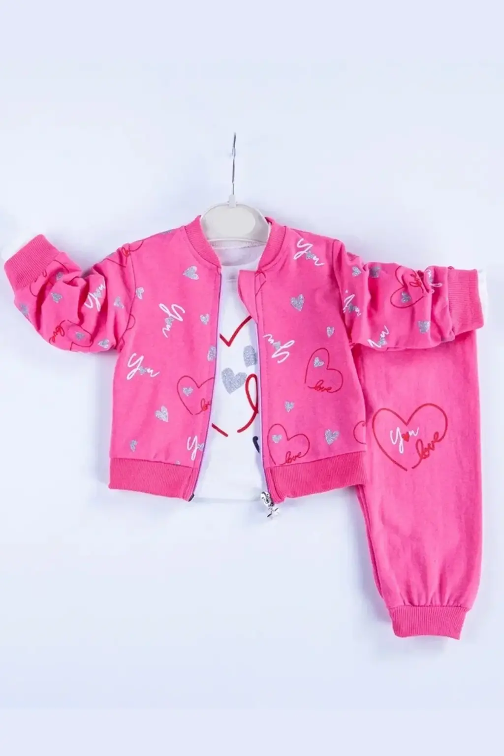 Kalp Desenli Hırkalı Pamuklu 3'lü Kız Bebek Takımı