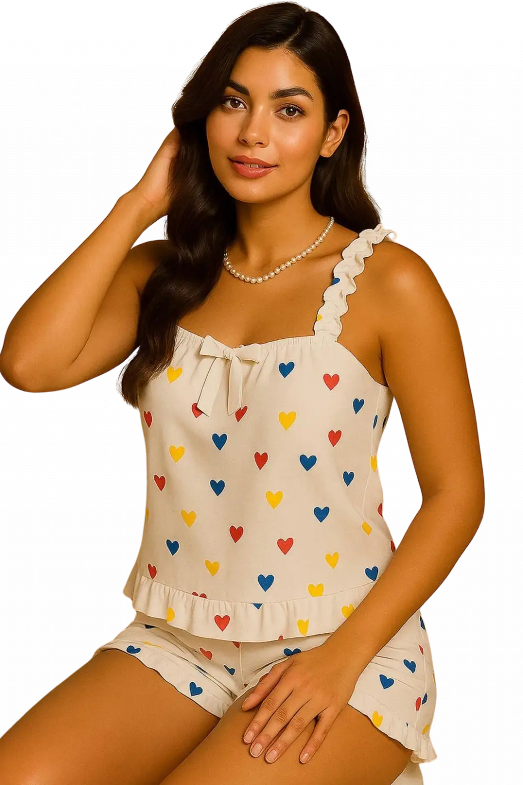 Kalp Baskılı Yumuşak Dokulu İp Askılı Şortlu Örme Pijama Takımı