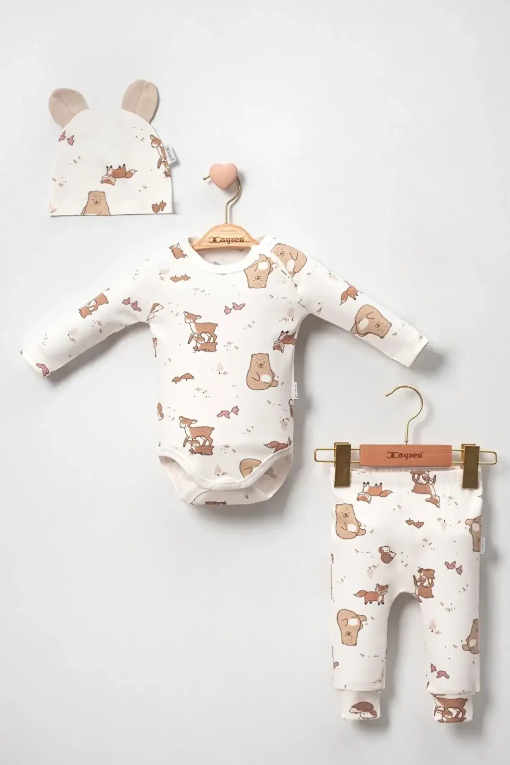 Karaca Desenli % 100 Pamuk 3'lü Şapkalı Erkek Bebek Takım