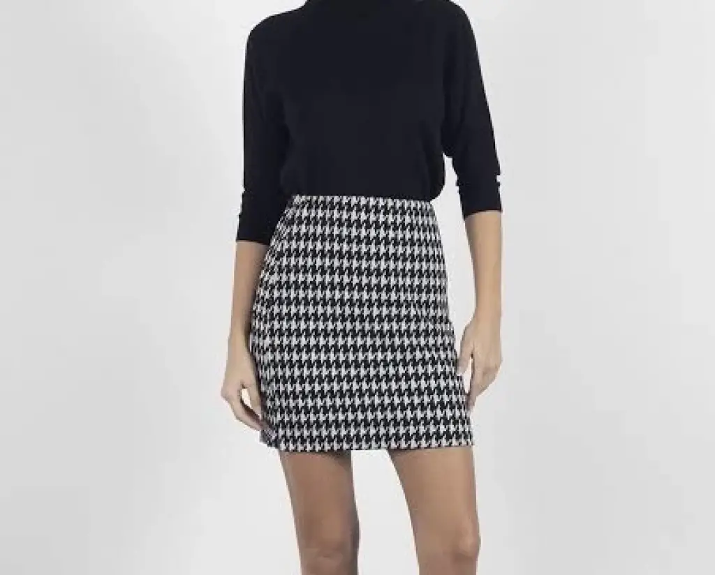 KAZAX markasının göz alıcı siyahbeyaz renklerdeki kazayağı desenli likralı mini etek, gardırobunuzun vazgeçilmezi olmaya aday. Hem şık hem de rahat yapısıyla her türlü kombinle harika uyum sağlar.