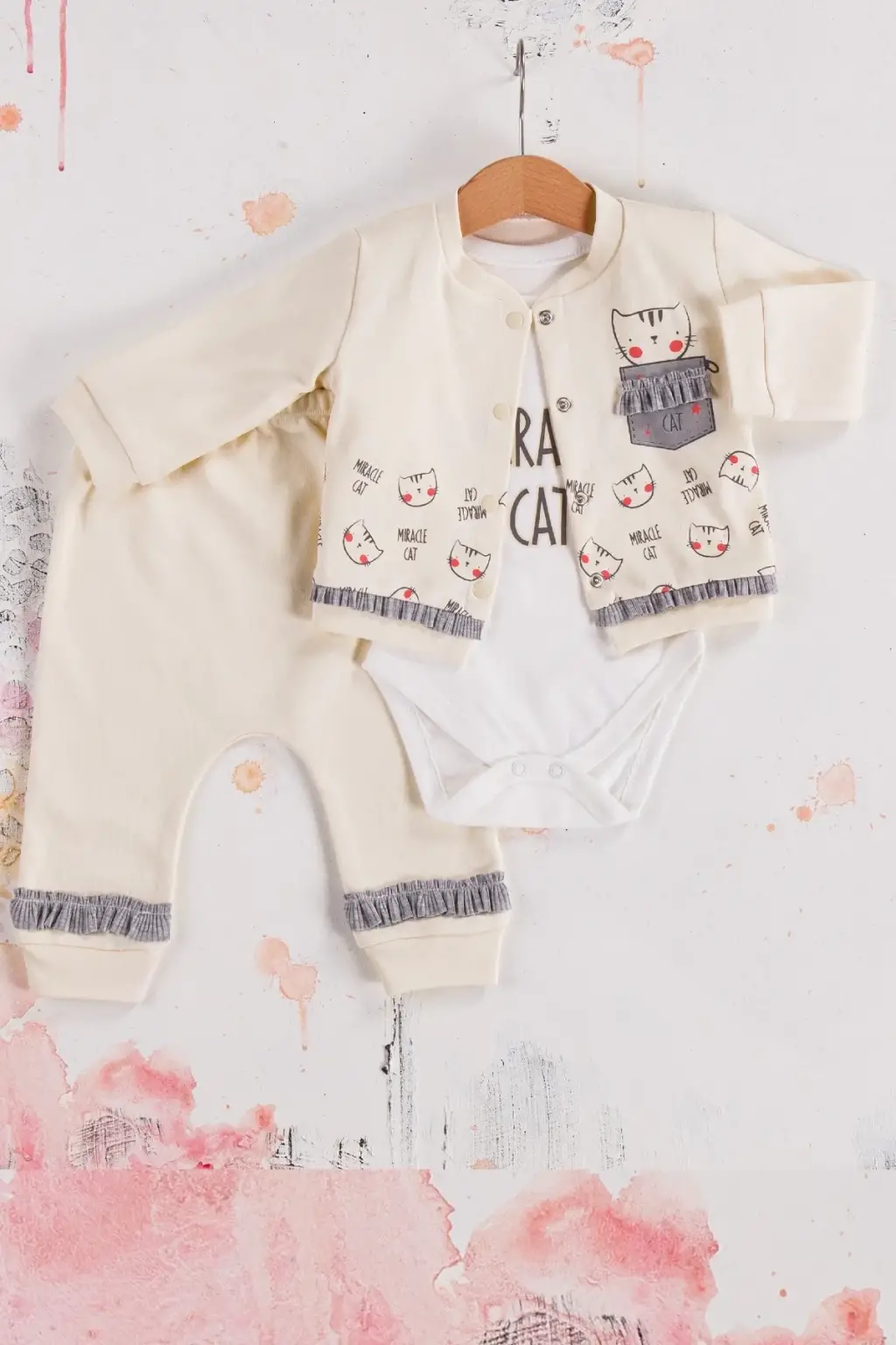 Kedi Desenli 3'lü Hırkalı Kız Bebek Takım