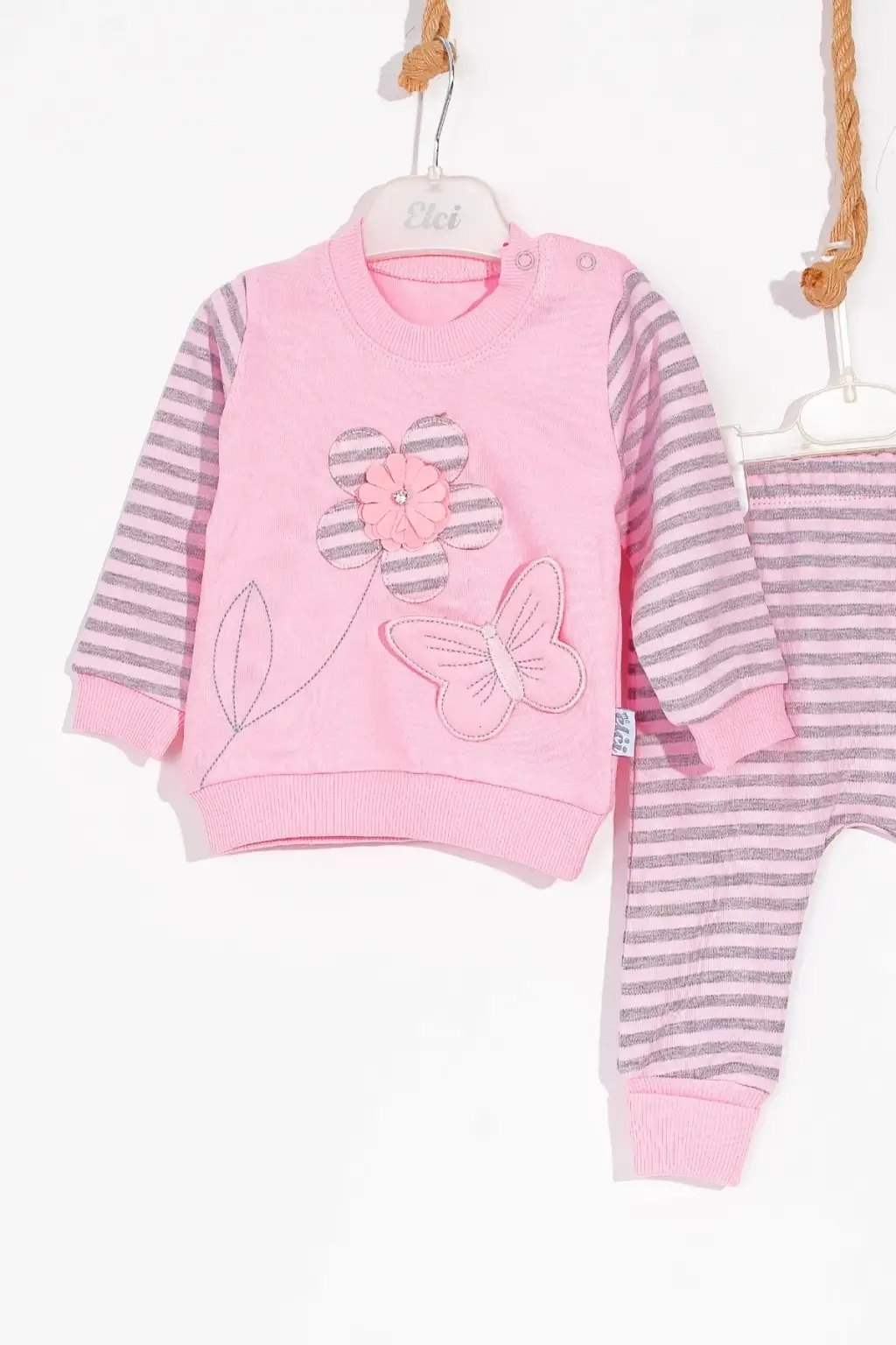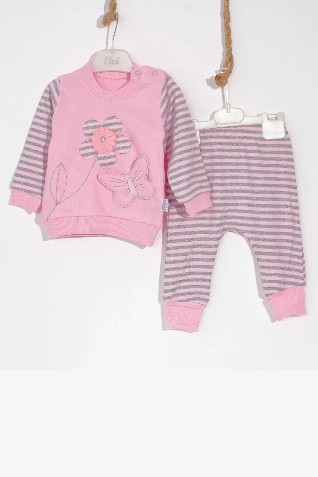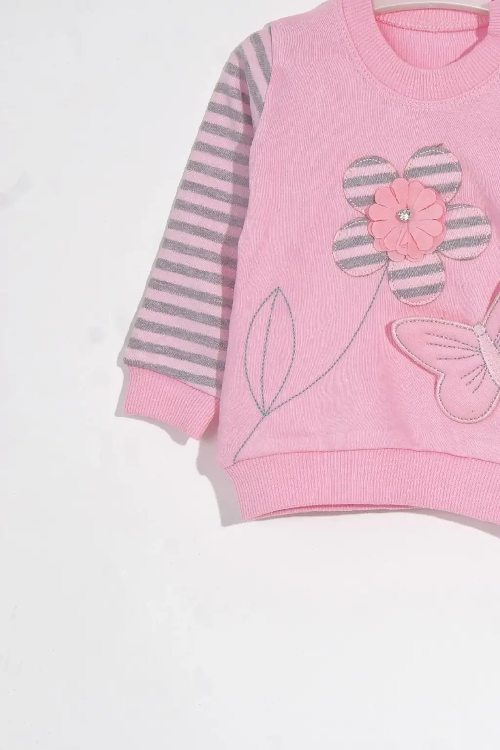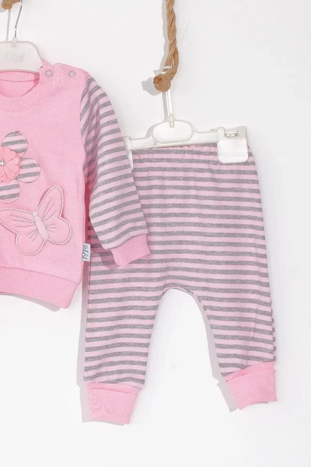 Kelebekli Çiçek Nakışlı Pamuklu 2'li Kız Bebek Takımı
