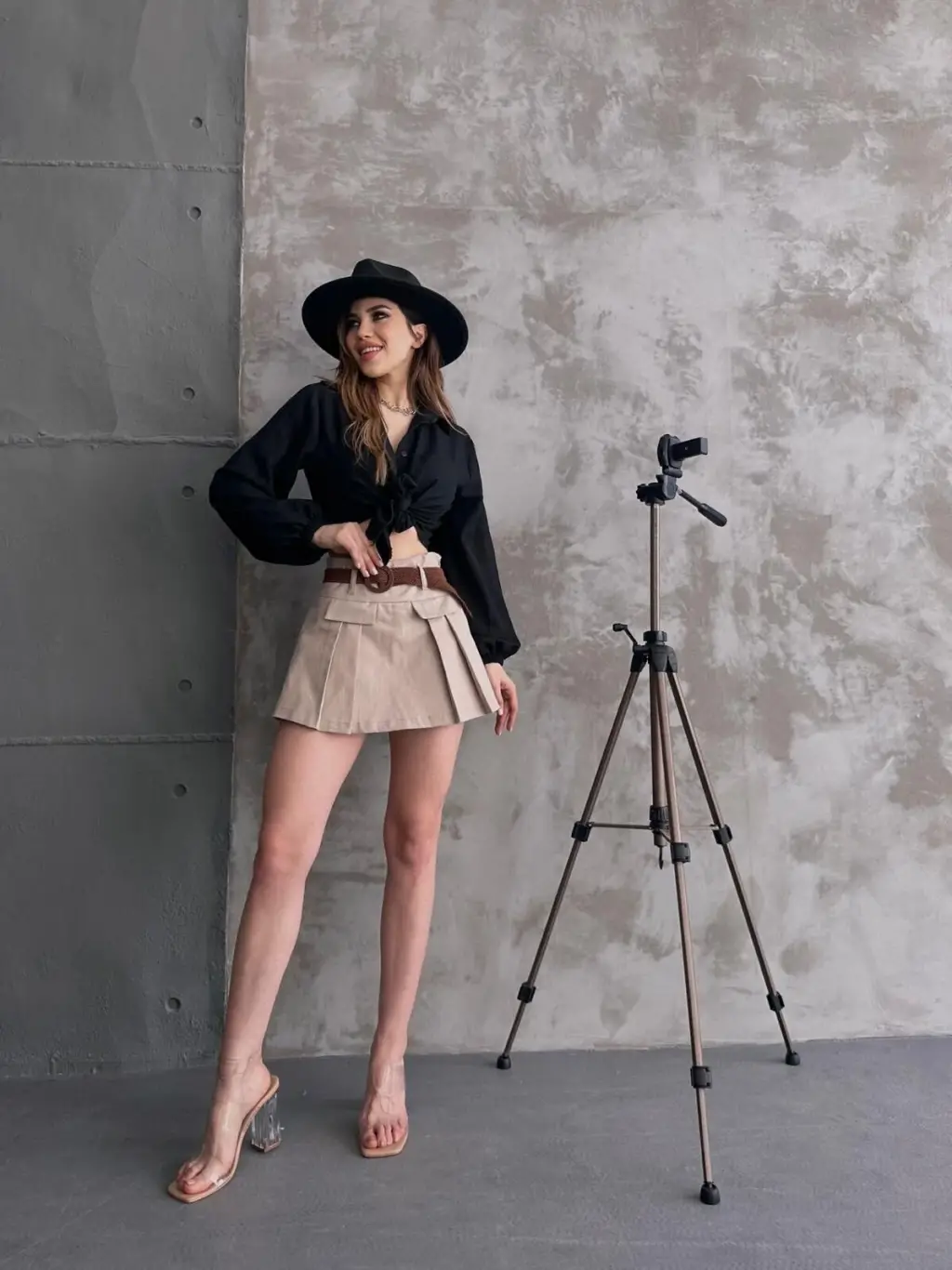 ŞANELKAPAKLI ÇOBAN DİKİŞ DETAYLI KISA ETEK - Bej