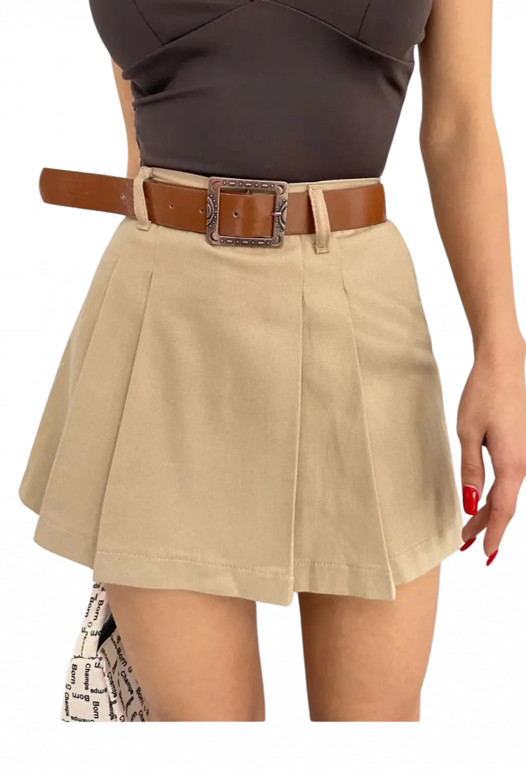 Kemerli Pileli Şort Etek - Kahverengi, yaz aylarının vazgeçilmez parçalarından biri olarak tasarlandı. Hem rahat hem de şık bir görünüm sunan bu etek, günlük kullanım için ideal bir seçimdir. Hem ofis ortamlarında hem de sosyal etkinliklerde şık bir kombin oluşturmanıza yardımcı olur.