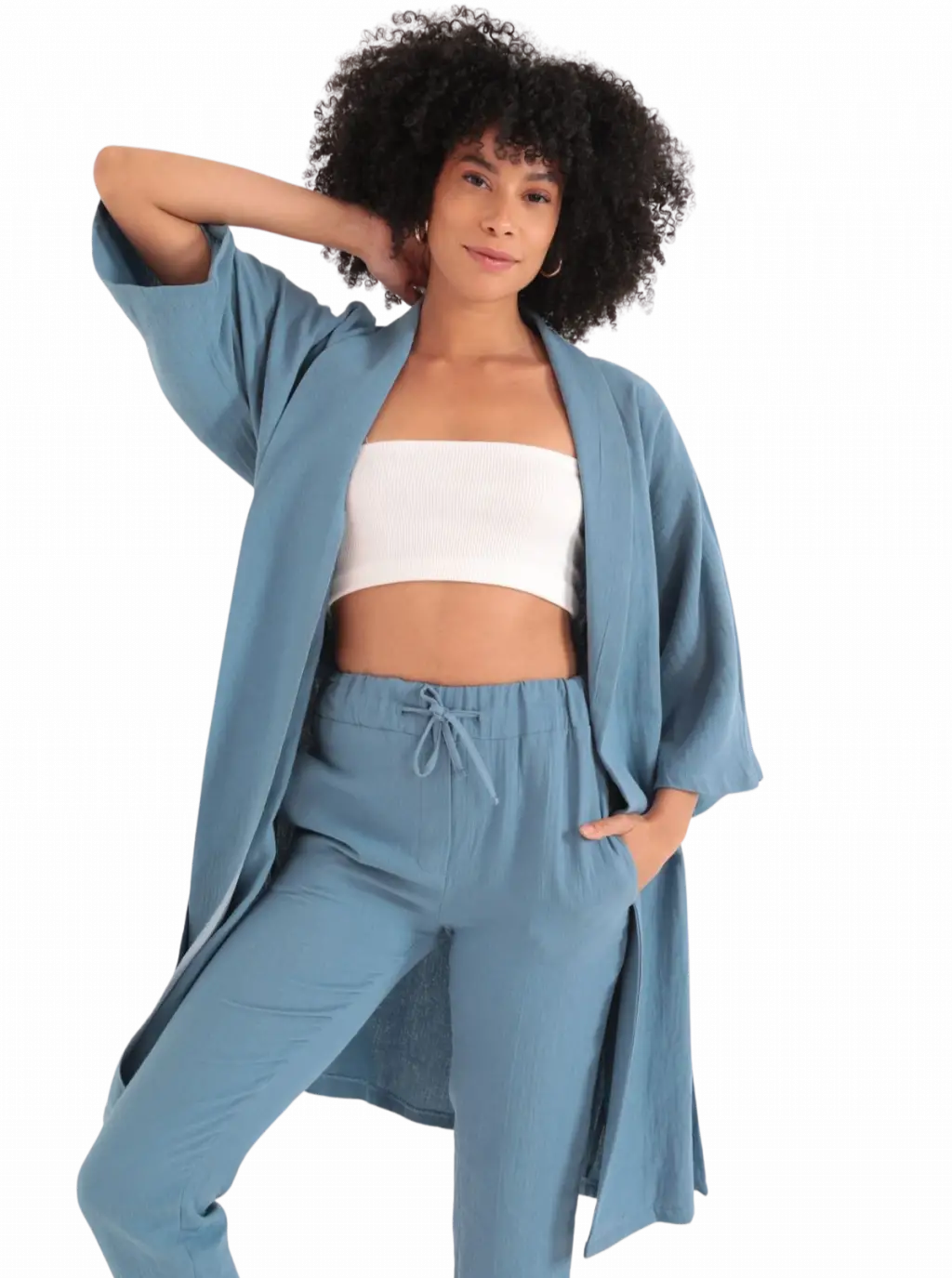 Koleksiyonumuzun en özel parçalarından biri olan Kimono Üst - İNDİGO, şıklığı ve rahatlığı bir arada sunan benzersiz bir tasarımdır. Kapalı alanlarda ve açık havada rahatlıkla giyilebilen bu kimono, konforlu bir görünüm sağlarken stilinizi de ön plana çıkarır.