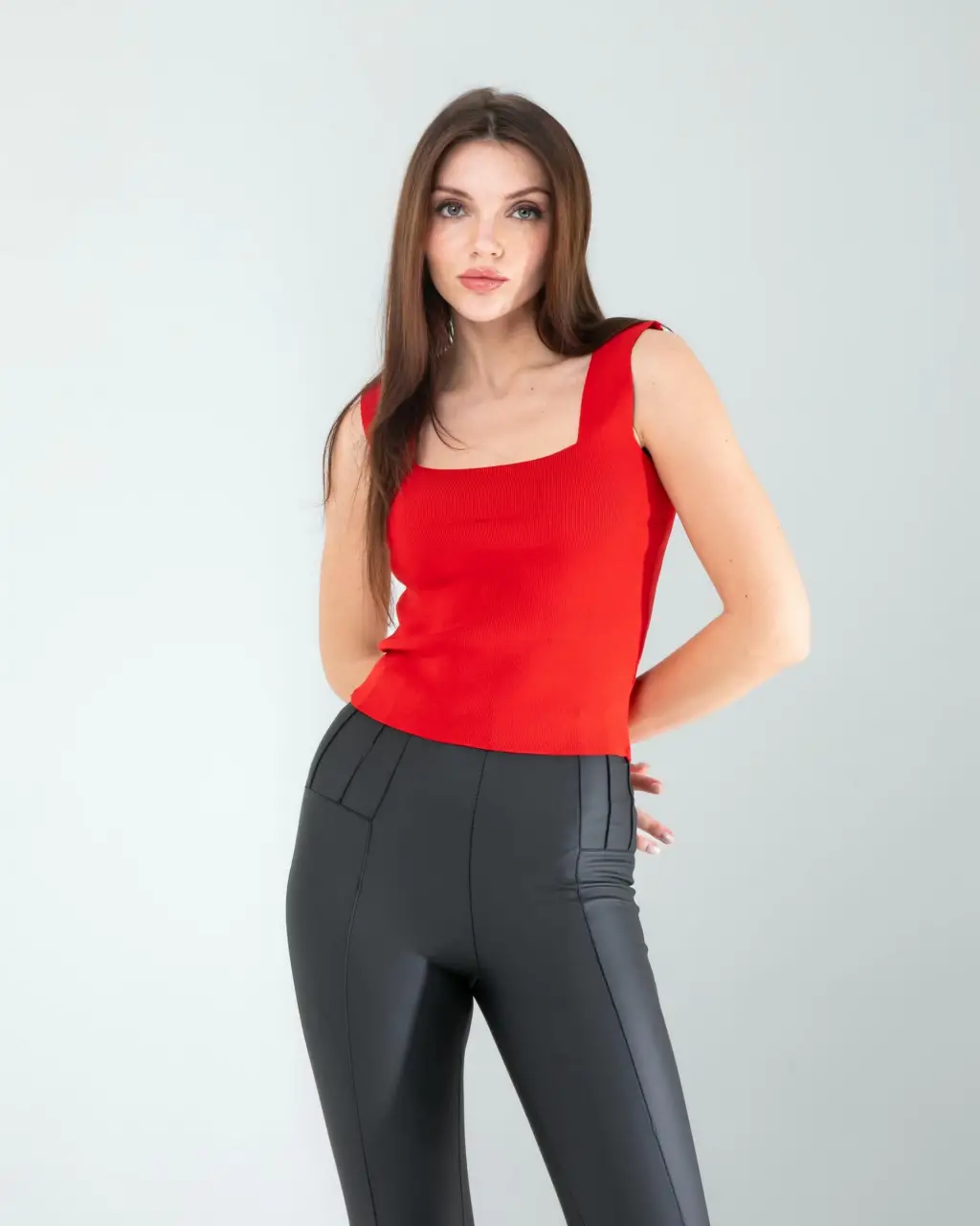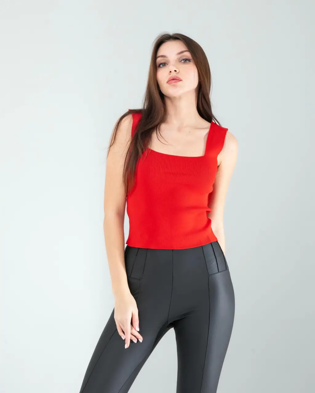 Kırmızı Kare Yaka Kalın Askı Triko Crop Bluz
