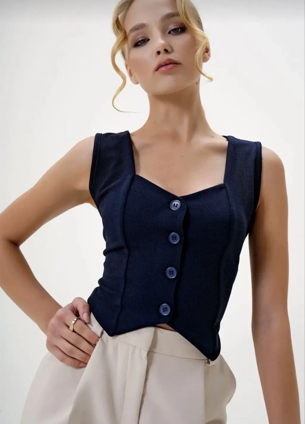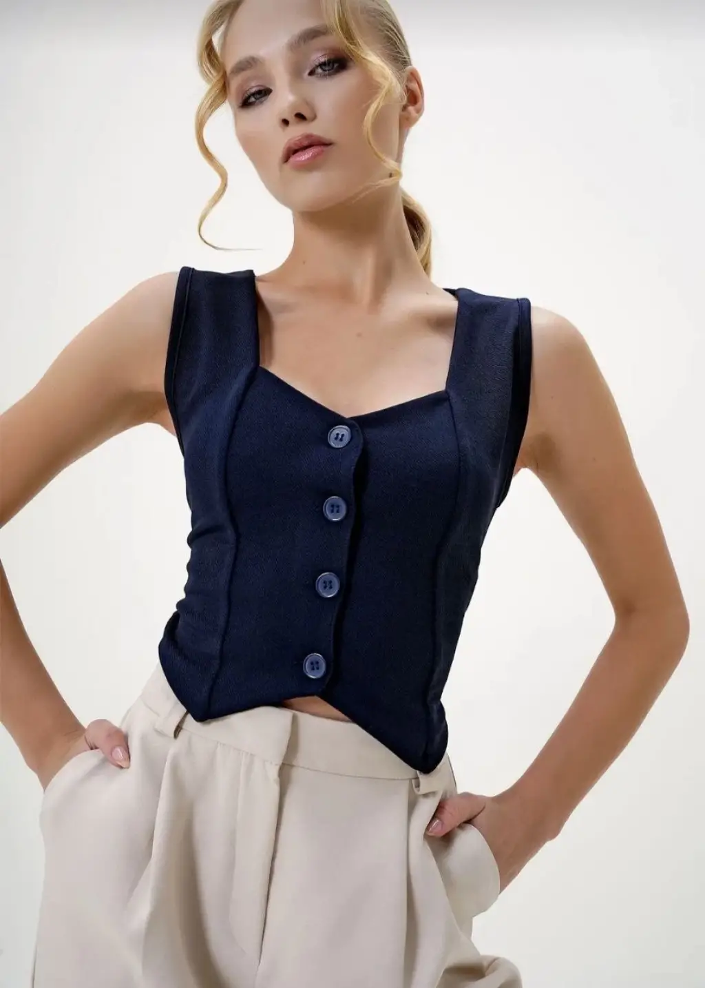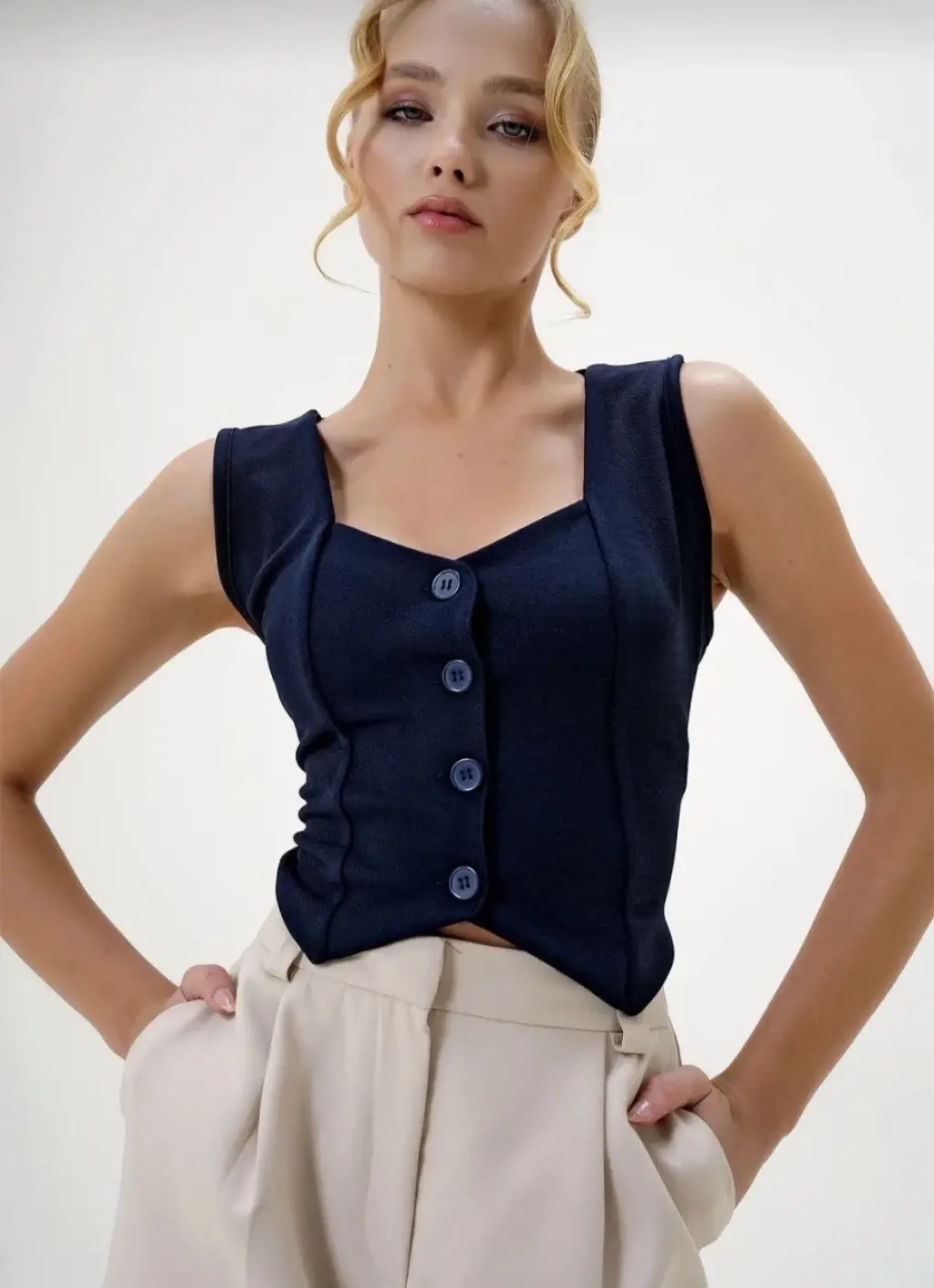Modaya uygun tasarımı ve pratik kullanımıyla Krep Kumaş Düğmeli Yelek Lacivert S3395, kombinlerinizi tamamlamak için ideal bir seçenektir.