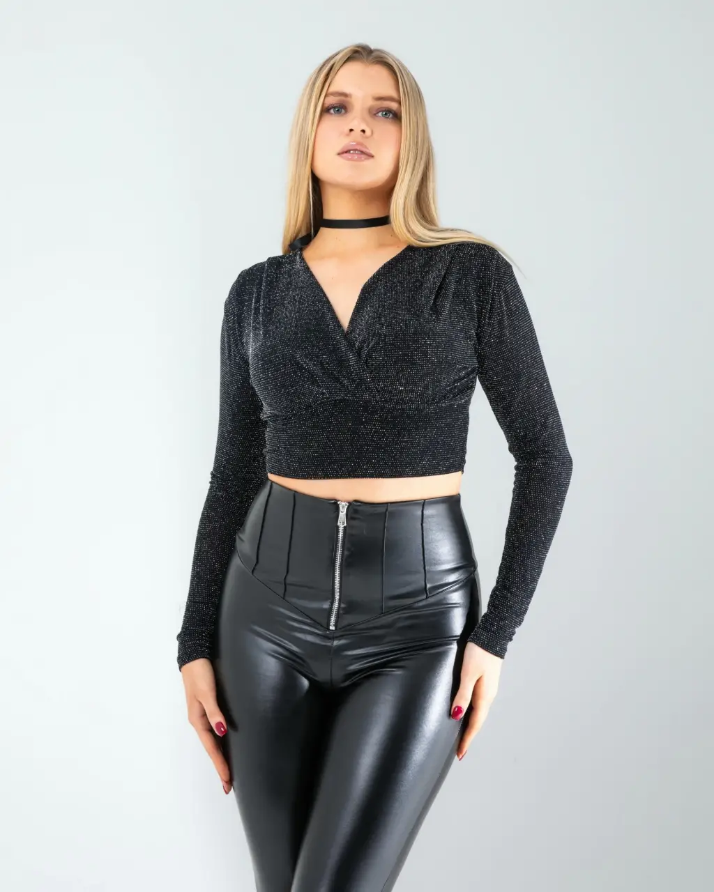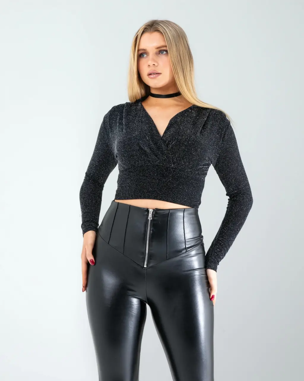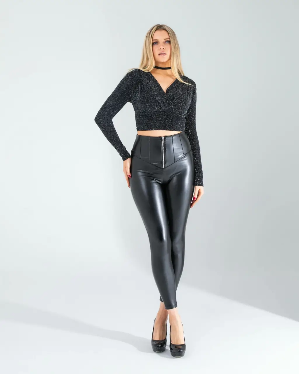 Gece Şıklığı: Kruvaze yaka pullu bodynizi dar paça siyah deri pantolon ve topuklu botlarla kombinleyerek gece davetlerine hazır olabilirsiniz. Parlak aksesuarlarla bu kombini destekleyebilirsiniz.