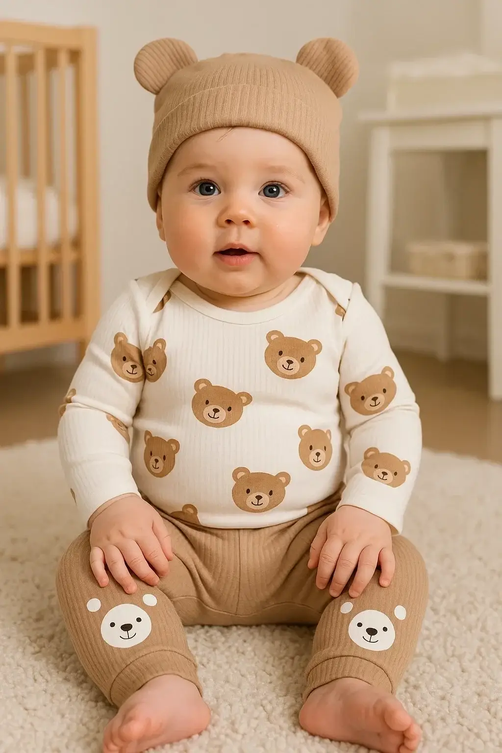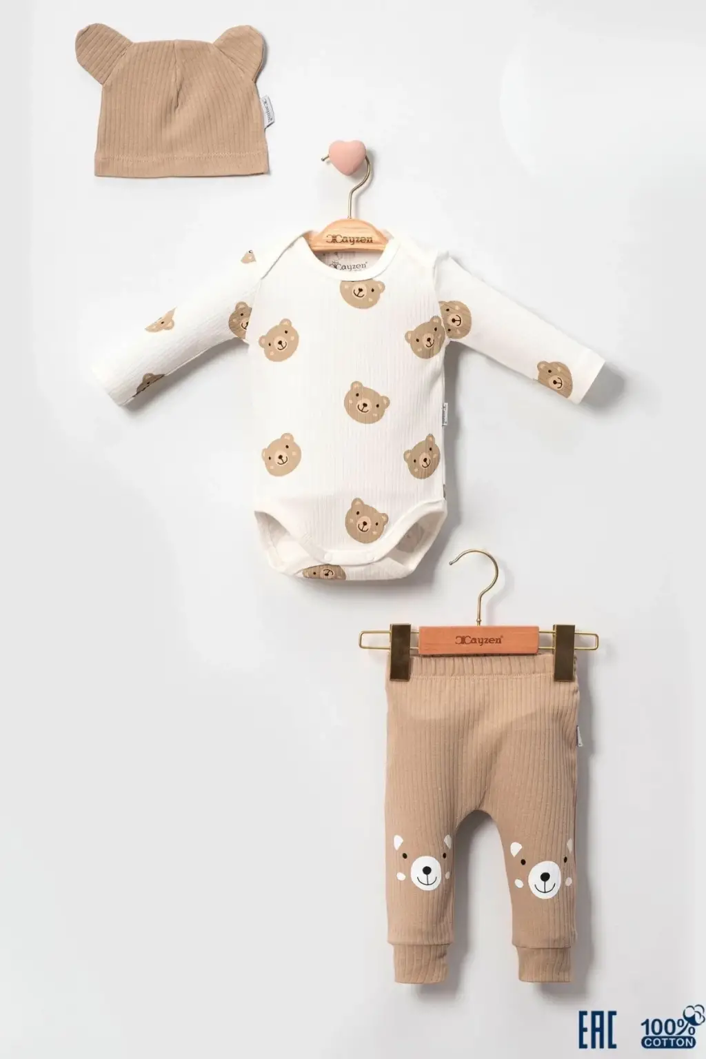 Kulaklı Ayıcık % 100 Pamuk 3'lü Erkek Bebek Takım
