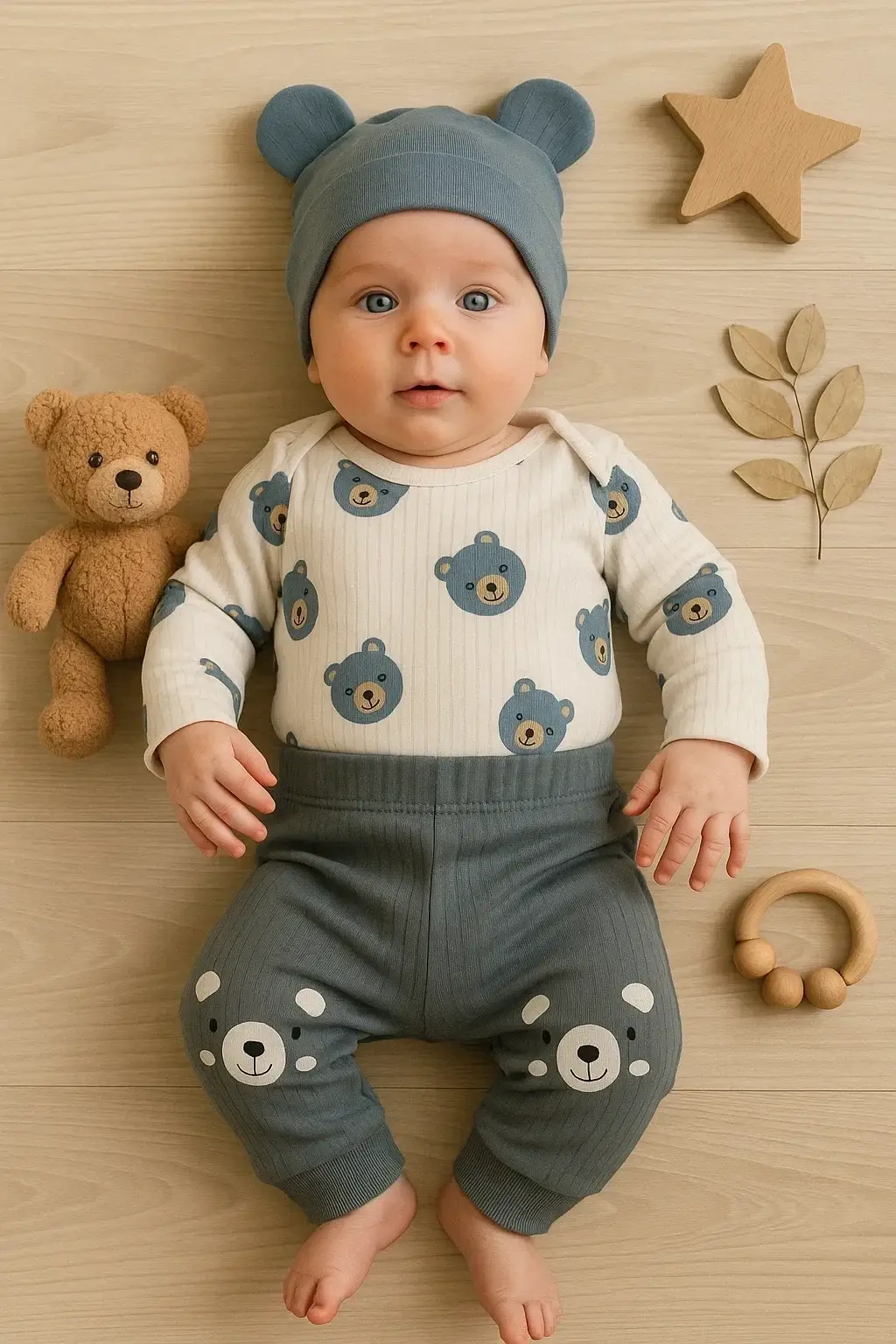 Kulaklı Ayıcık % 100 Pamuk 3'lü Erkek Bebek Takım