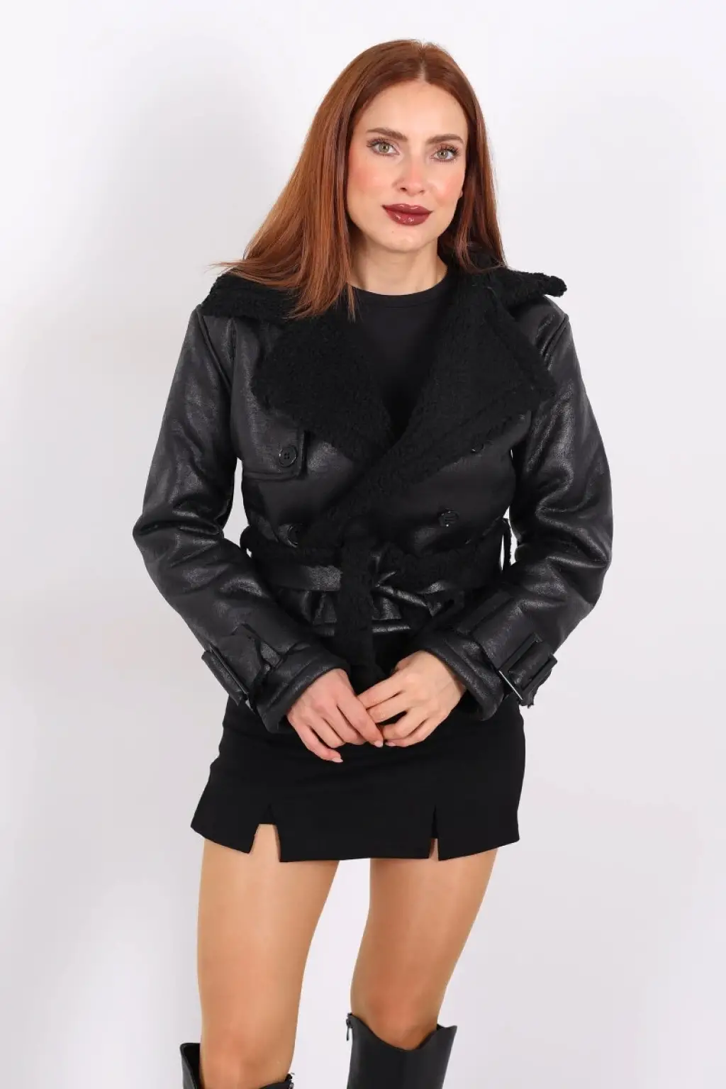 Bu kürklü suni deri kemerli siyah kadın kısa mont, hem şıklığı hem de konforu bir arada arayan kadınlar için ideal bir seçimdir.