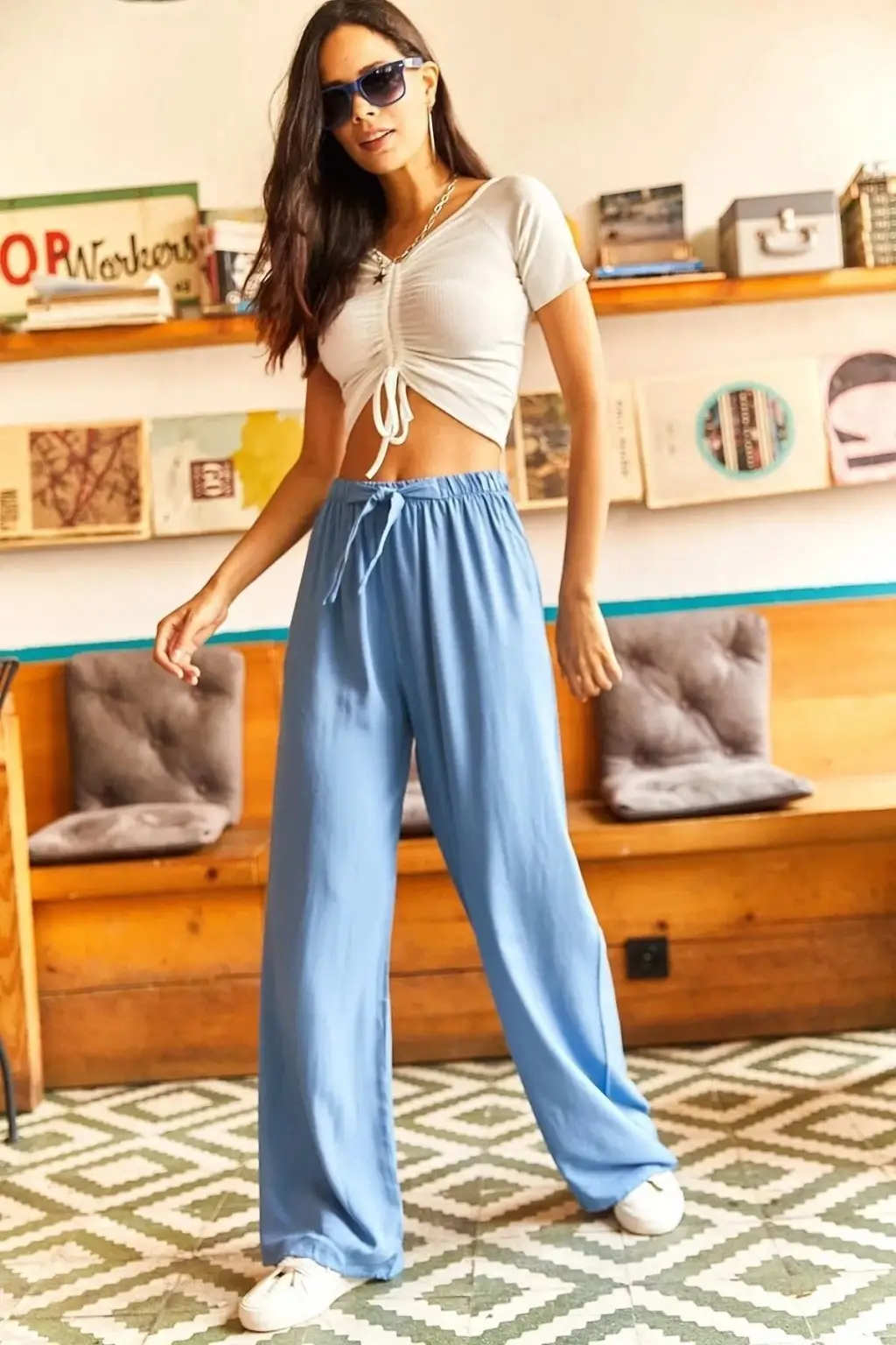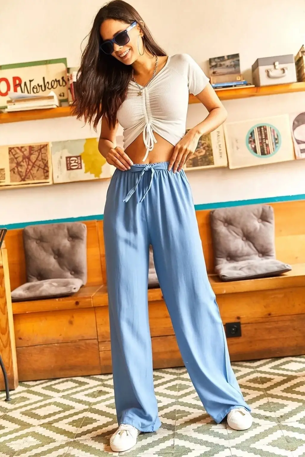 - Günlük Şıklık: Bebe mavi palazzo pantolonunuzu, beyaz bir basic tişört ve beyaz sneakers ile kombinleyin. Üzerine kot ceket ekleyerek rahat ve şık bir görünüm elde edebilirsiniz.
