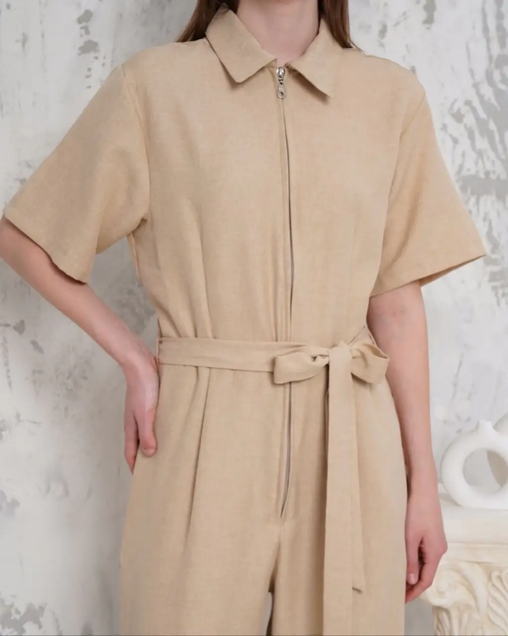 Kuşaklı gömlek yaka salaş tulum bej s255822