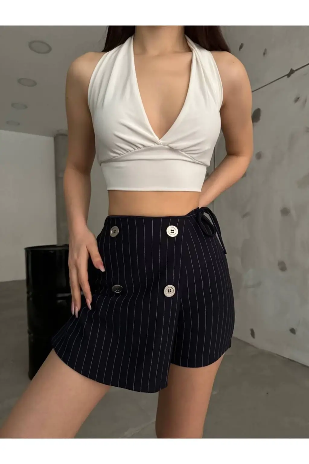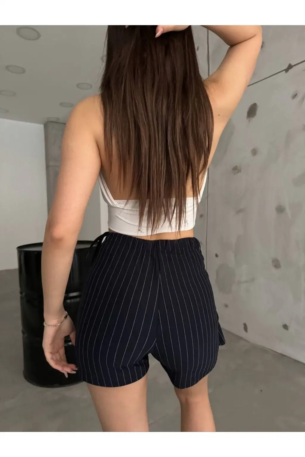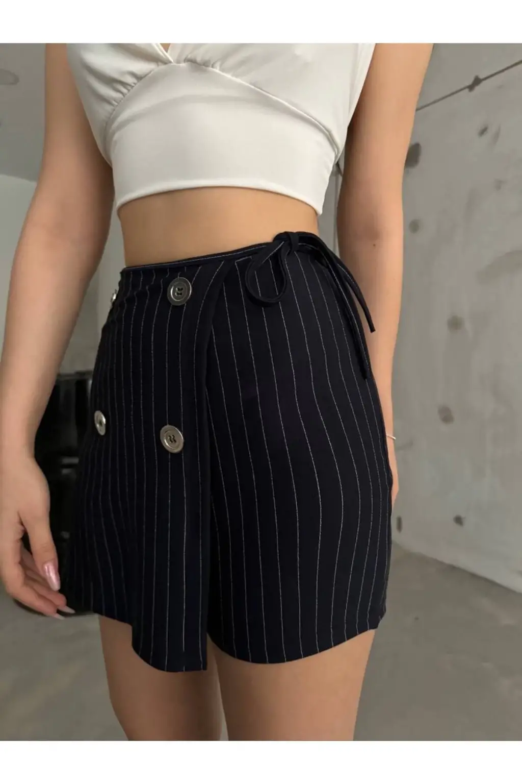 Lacivert Düğme Detaylı İtalyan Çizgili Şort Etek