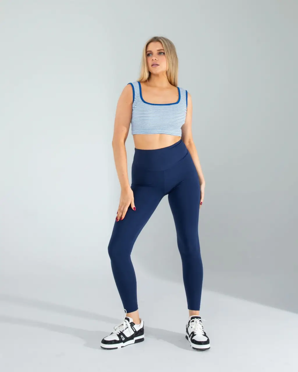 Spor Kombini: Lacivert OYS taytınızı beyaz bir spor bra ve beyaz spor ayakkabılarla tamamlayın. Üzerine ince bir rüzgarlık ekleyerek spor şıklığınızı tamamlayabilirsiniz.