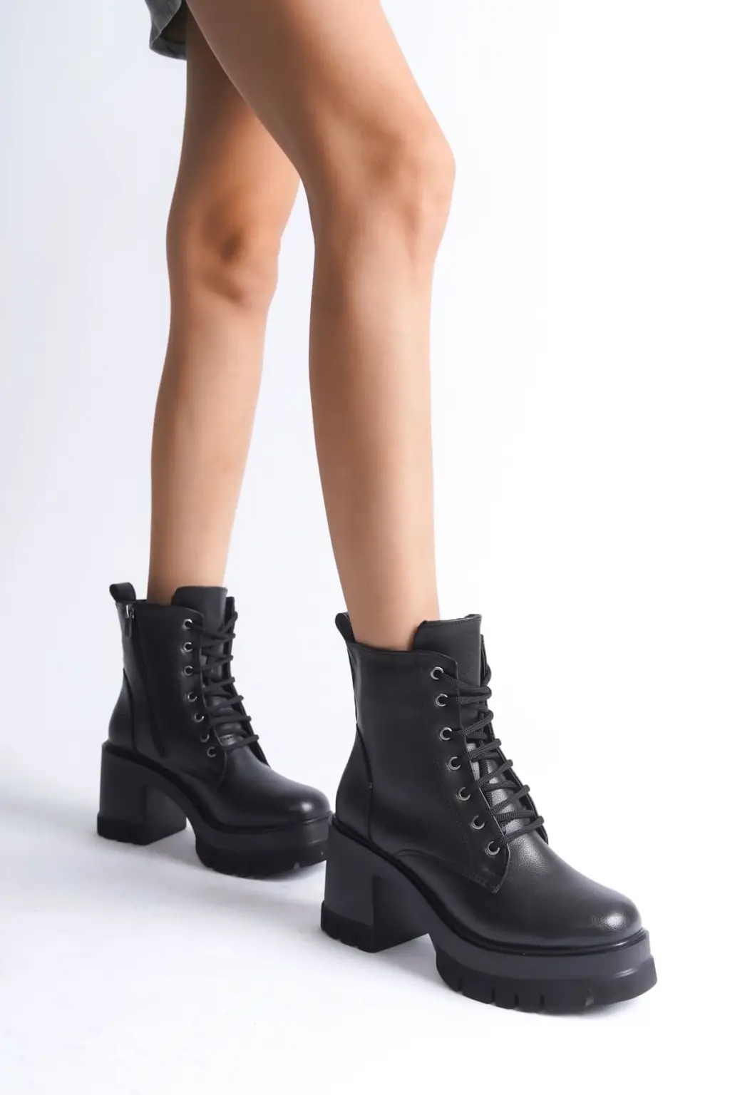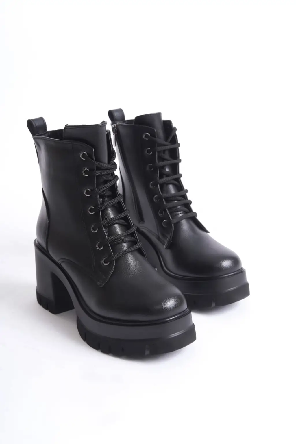 Şık Bağcıklı Tabaan Topuklu Bayan Bot - Siyah