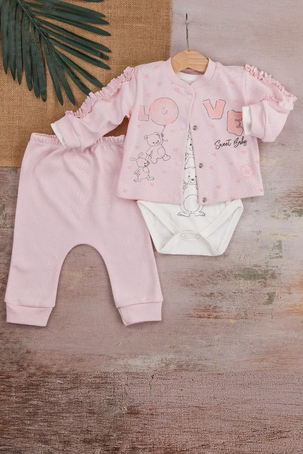 Love Tavşan Desenli Kol Detaylı 3'lü Hırkalı Kız Bebek Takım