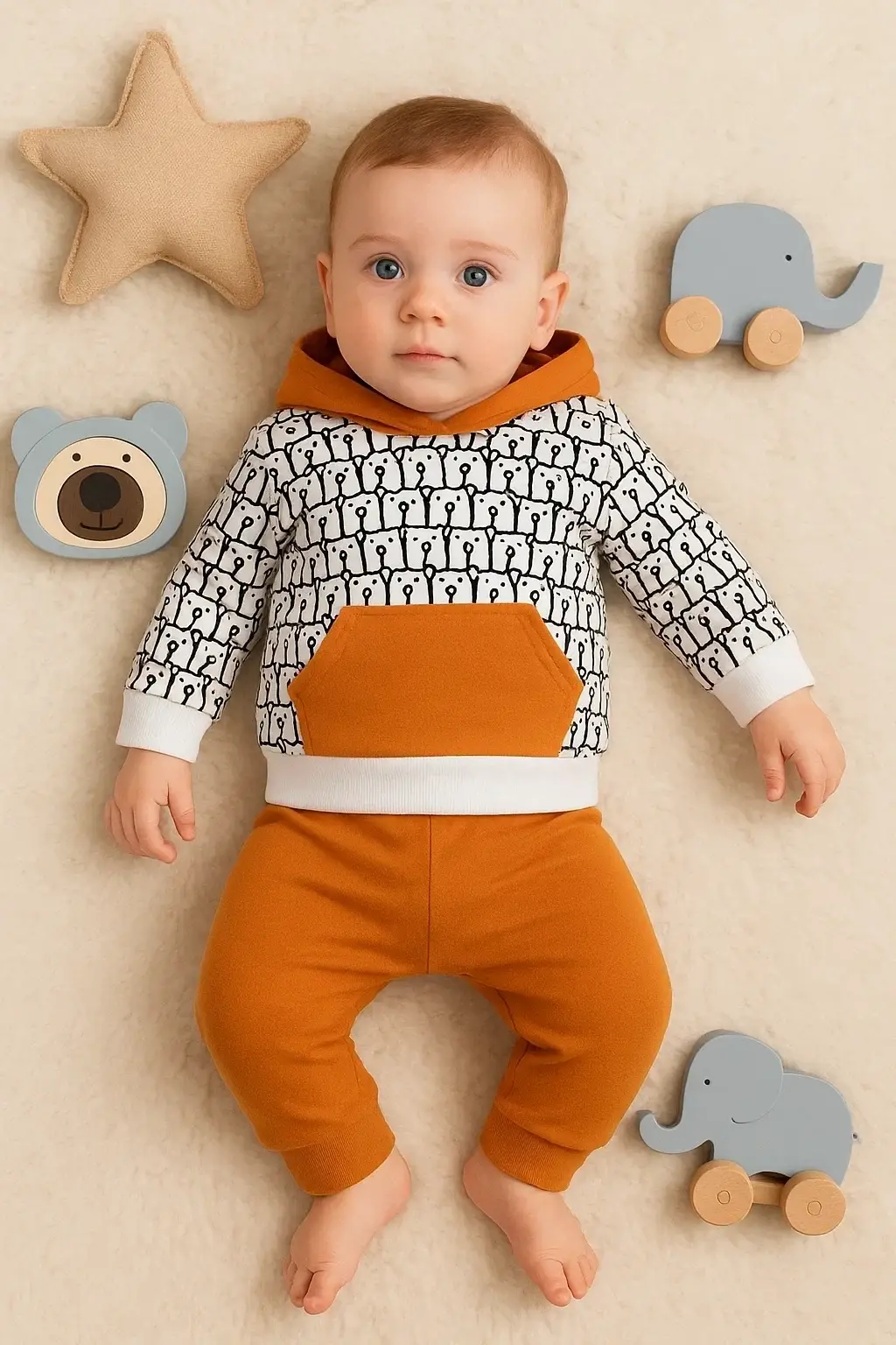 Minik Ayıcıklar Desenli 2'li % 100 Pamuk Erkek Bebek Takımı