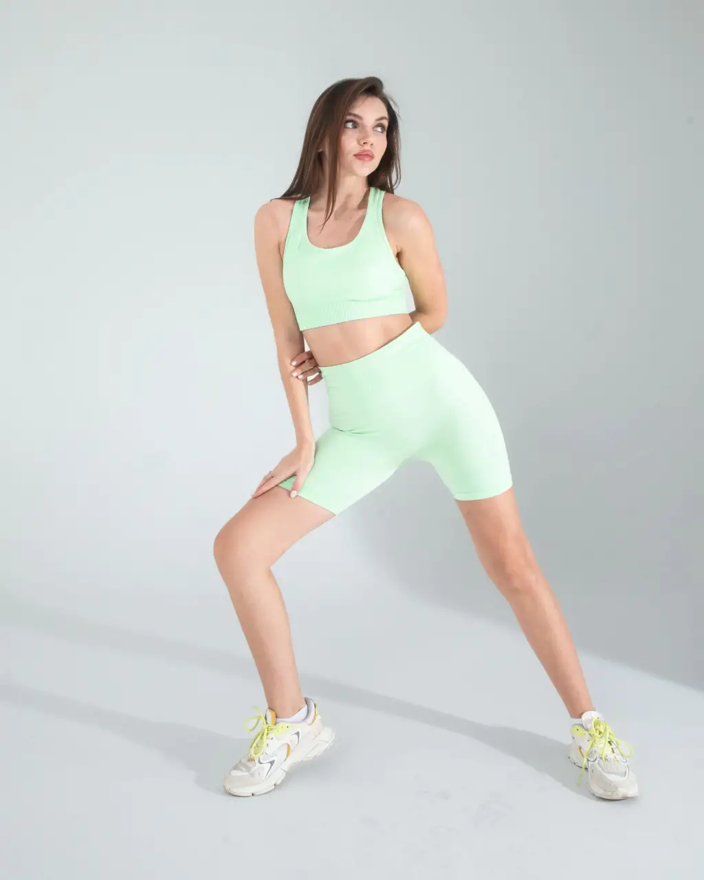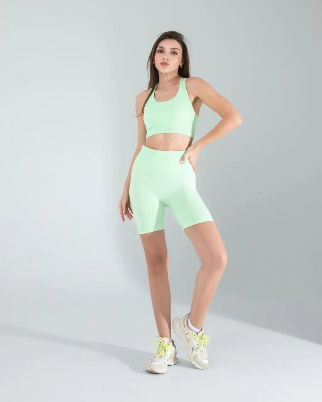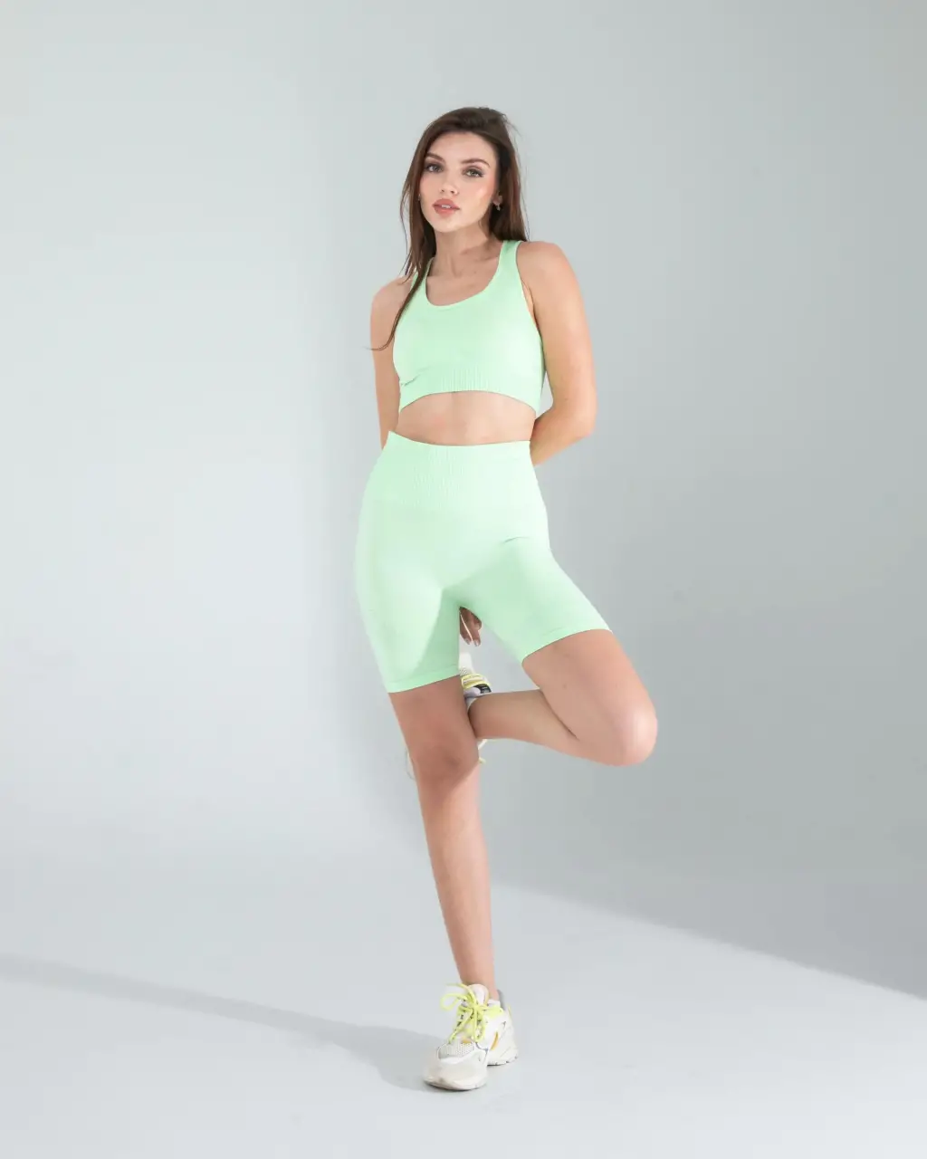 Spor Şıklığı: Mint Seamless Dikişsiz Biker Tayt Crop Takımınızı beyaz spor ayakkabılar ve beyaz bir spor çanta ile tamamlayarak spor salonunda şık ve rahat görünebilirsiniz.
