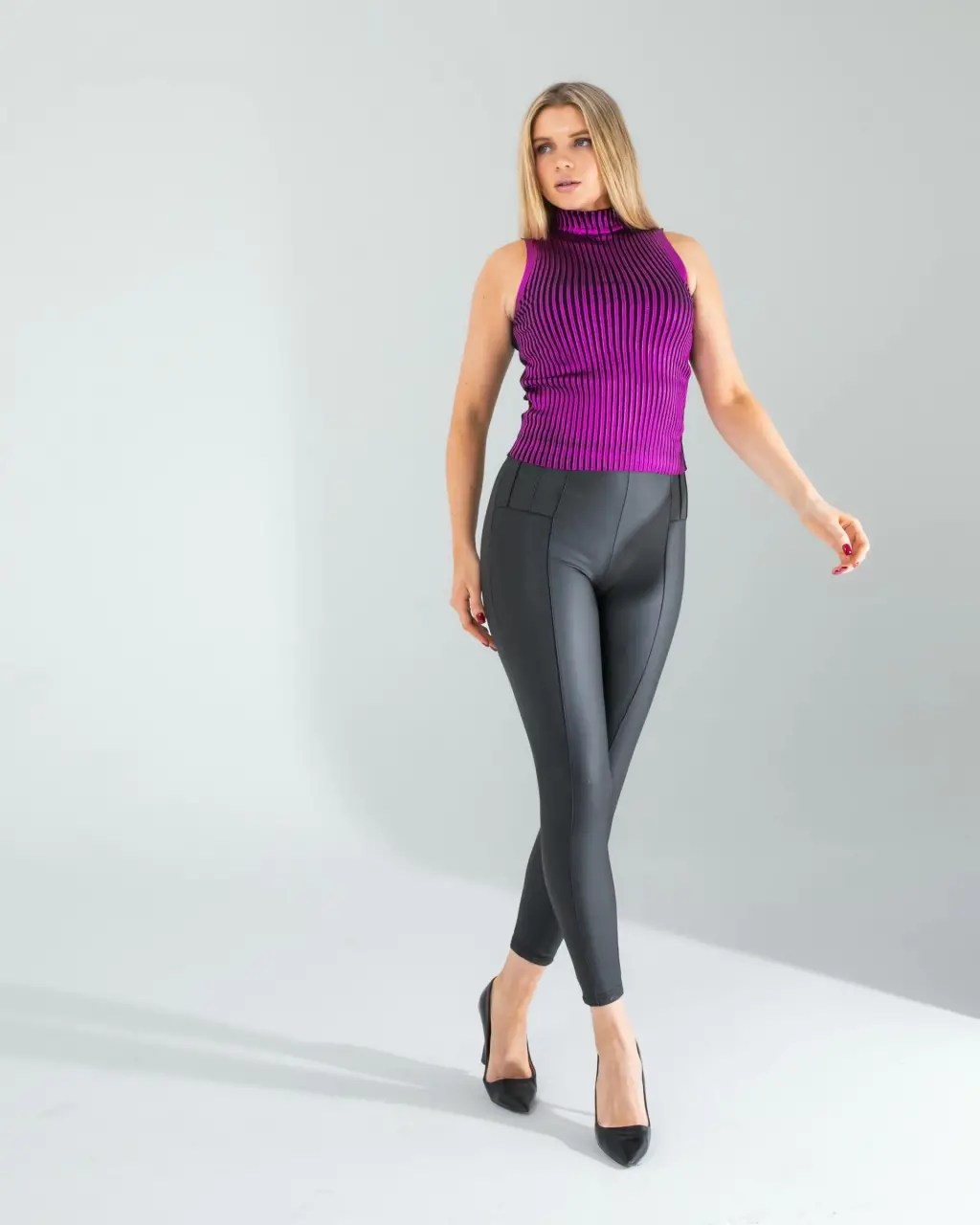 Deri Etek ve Topuklu Ayakkabı: Şık bir akşam yemeği veya özel bir etkinlik için, trikonuzu siyah deri etek ve siyah topuklu ayakkabılarla tamamlayın.