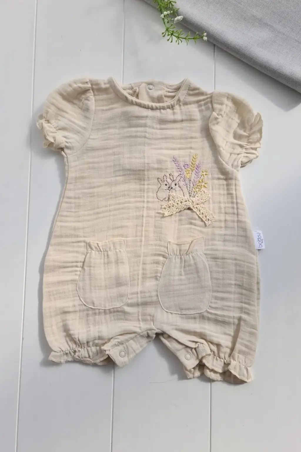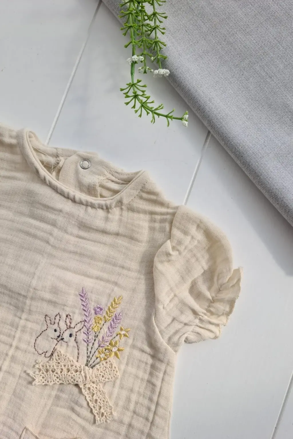 Müslin Kumaş Çiçek Nakışlı Pamuklu Kız Bebek Tulum