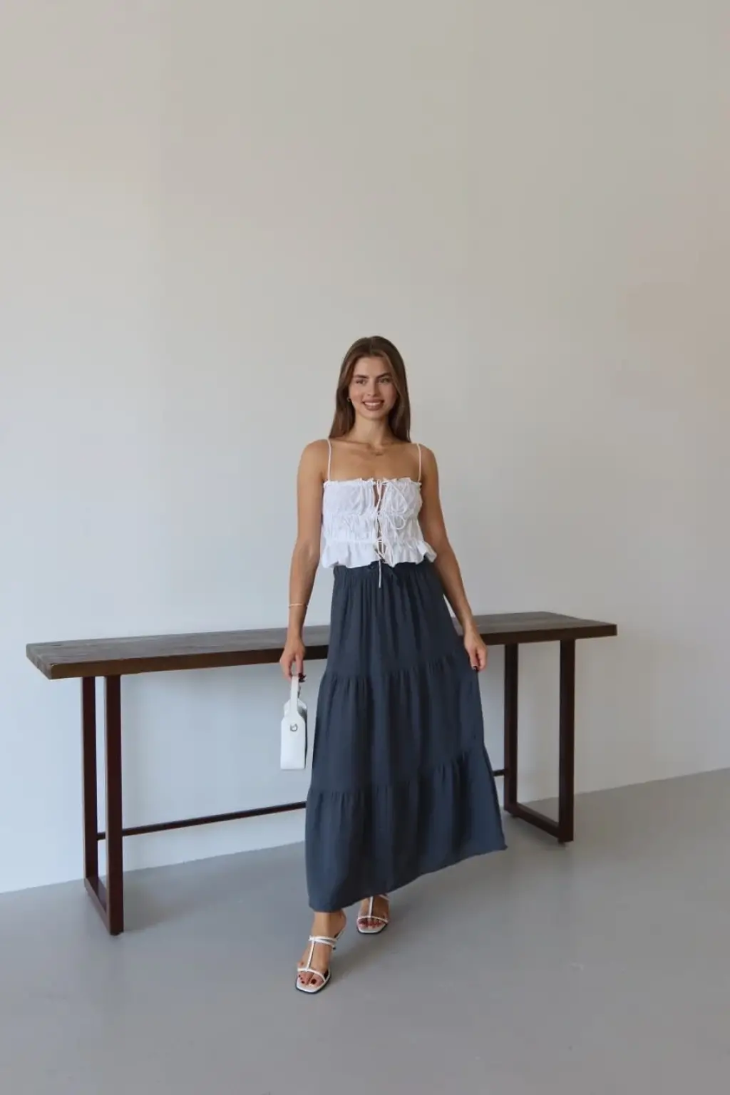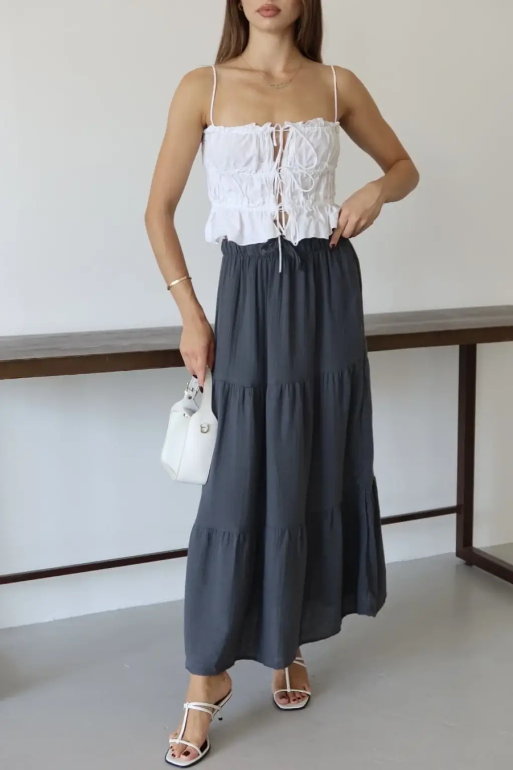 Yüksek kaliteli müslin ve keten karışımı ile üretilmiş uzun etek, gardırobunuzun vazgeçilmezi olmaya aday. Antrasit rengiyle şıklığı ve zarafeti bir arada sunan bu etek, her tarza kolaylıkla uyum sağlar. Rahat kesimi sayesinde gün boyu konfor sunarken, şık detaylarıyla da göz kamaştırır.