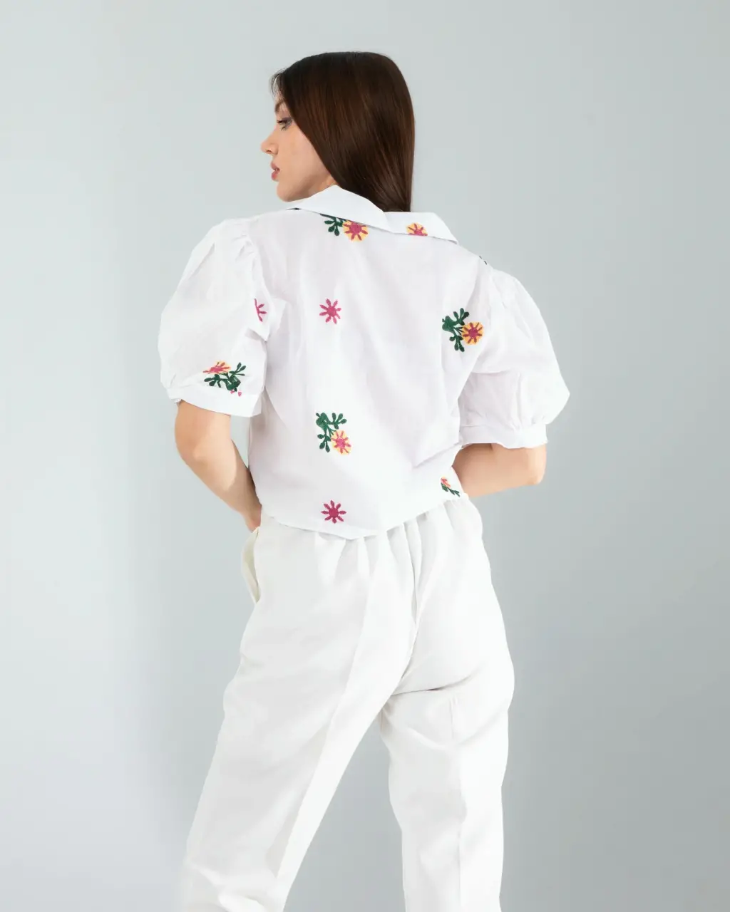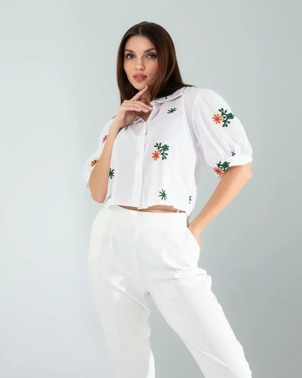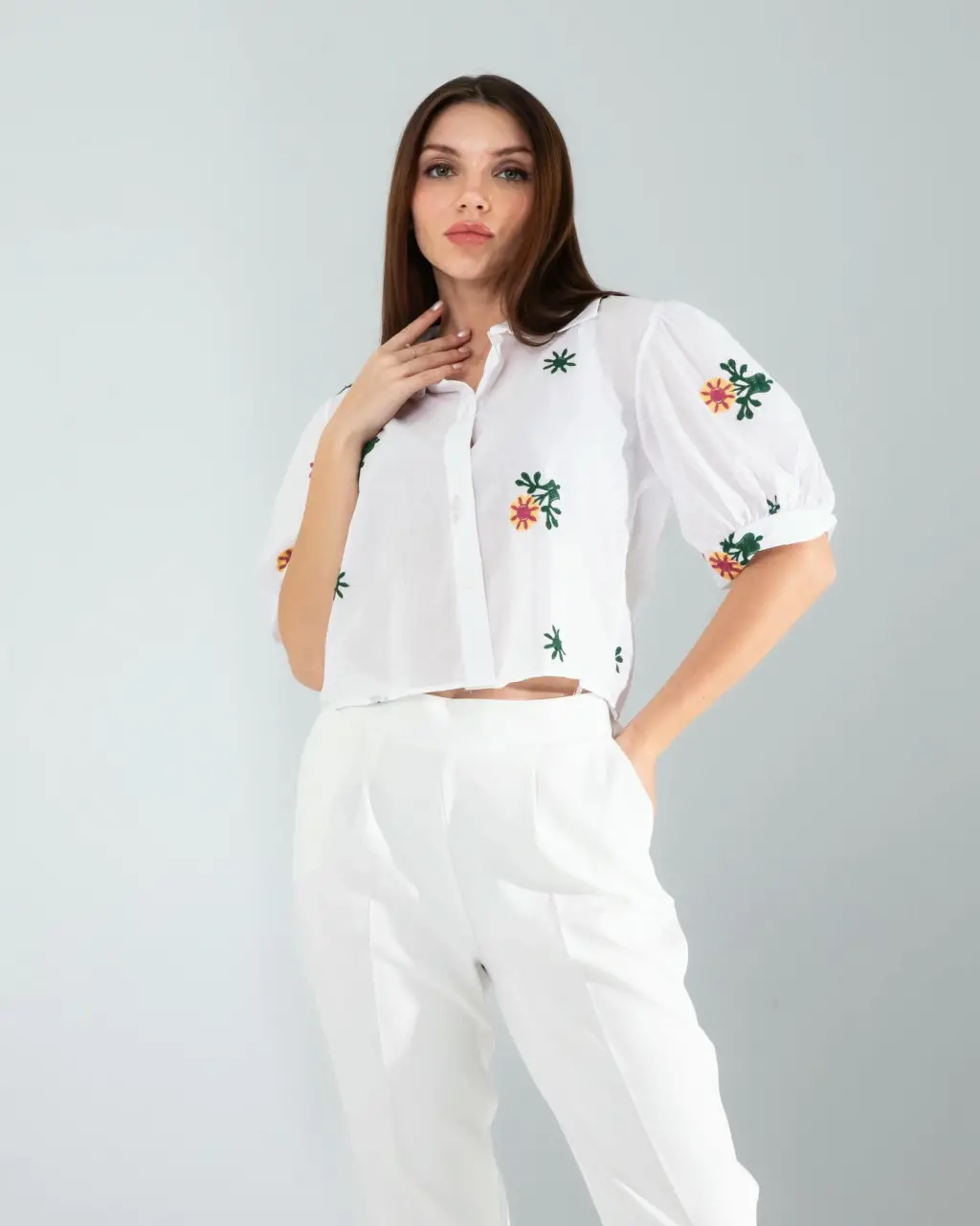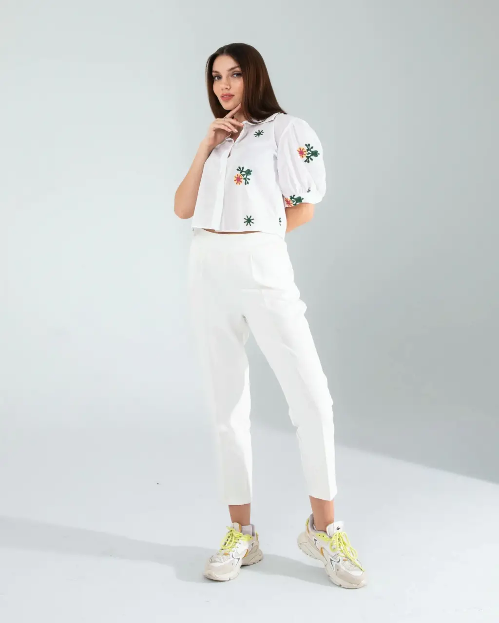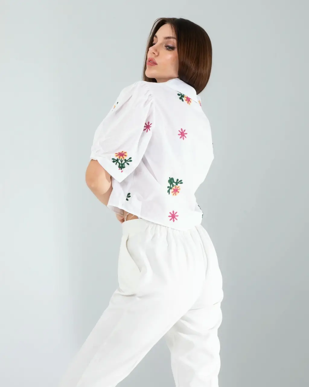 Spor Şıklık: Çiçek desen nakışlı beyaz mini gömleği yüksek bel tayt ve beyaz spor ayakkabılarla kombinleyin. Spor bir çanta ve güneş gözlüğü ile tamamlayarak sportif ve şık bir görünüm elde edebilirsiniz.
