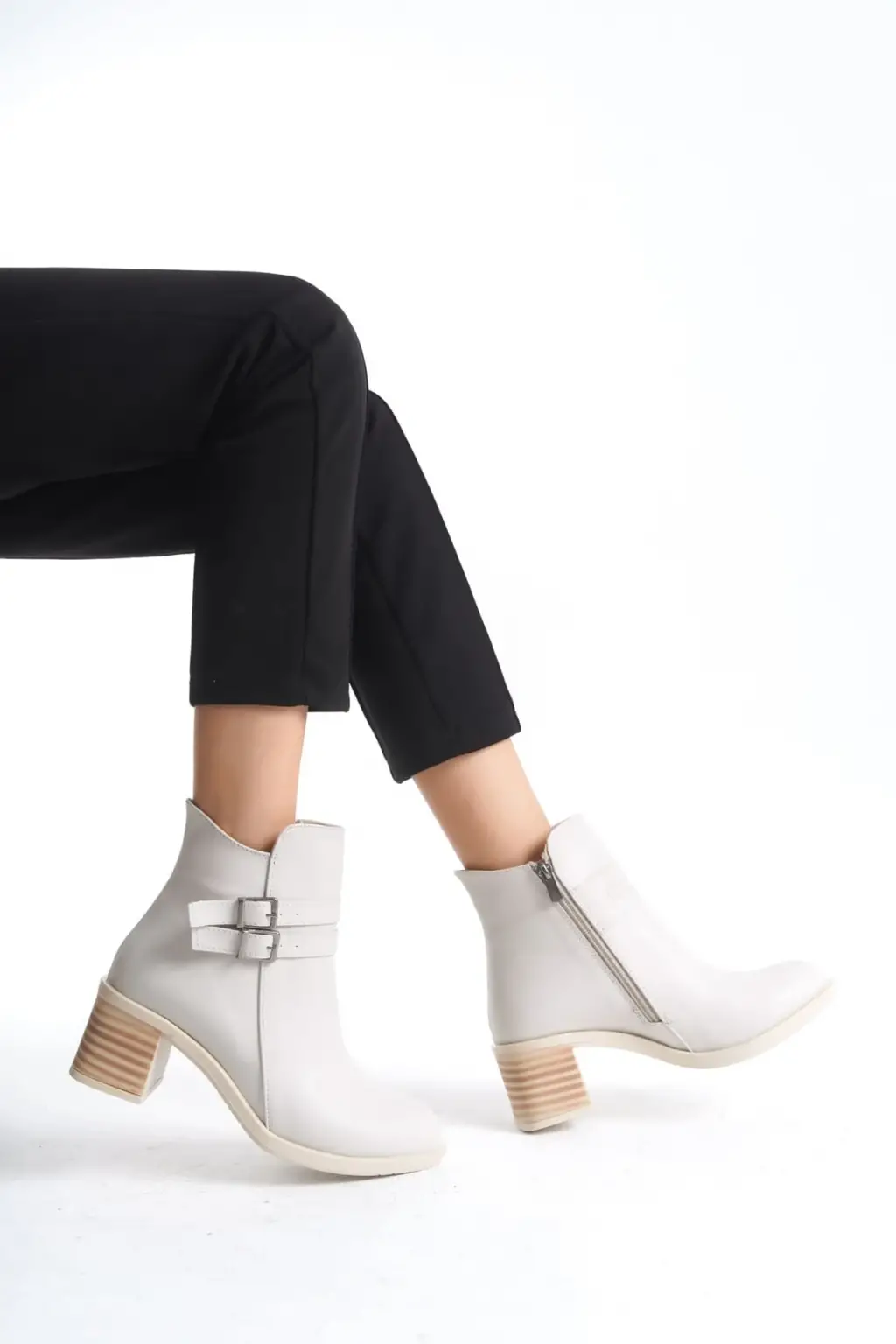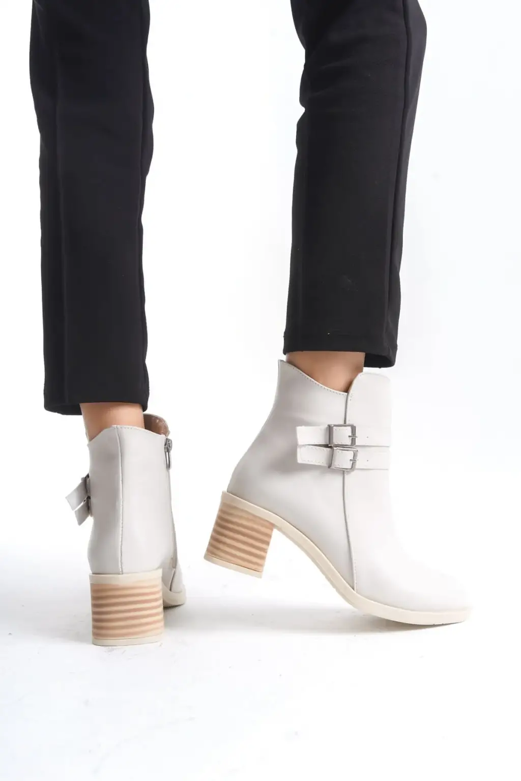 Omarı Tokalı Fermuarlı Rahat Tabanlı Bayan Bot - Krem