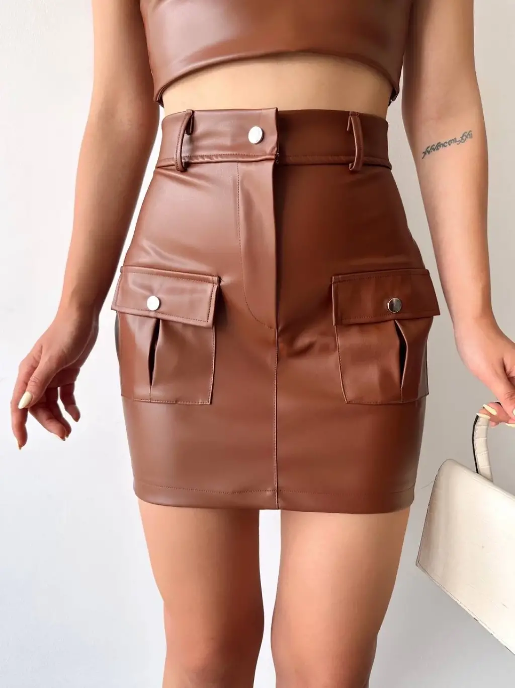 Bu özel tasarım deri etek, gardırobunuzun vazgeçilmezi olmaya aday! Şık ve şık bir görünüm sağlayan öndeki iki cepli detayı ile dikkat çekiyor.