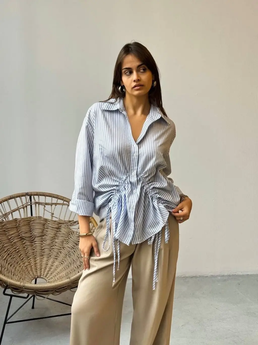 Önü büzgü detaylı çizgili gömlek, şıklığı ve rahatlığı bir arada sunuyor.
