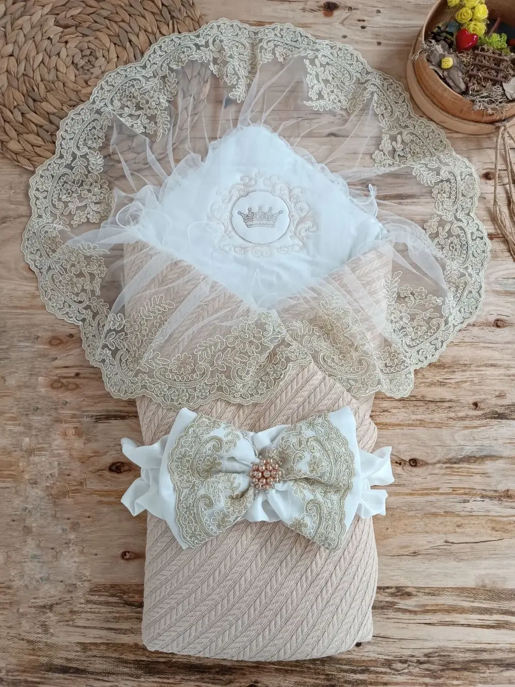 Örgü Tericotton Taç Nakışlı İncili Güpür Çift Fiyonk Papatya Güpür Trilüks Kundak Bebek Battaniyesi