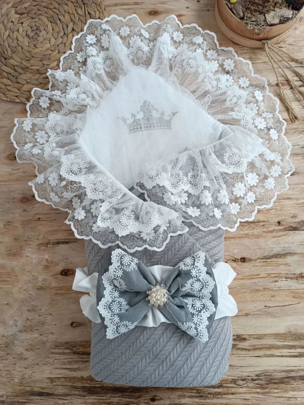 Örgü Tericotton Taç Nakışlı İncili Güpür Çift Fiyonk Papatya Güpür Trilüks Kundak Bebek Battaniyesi