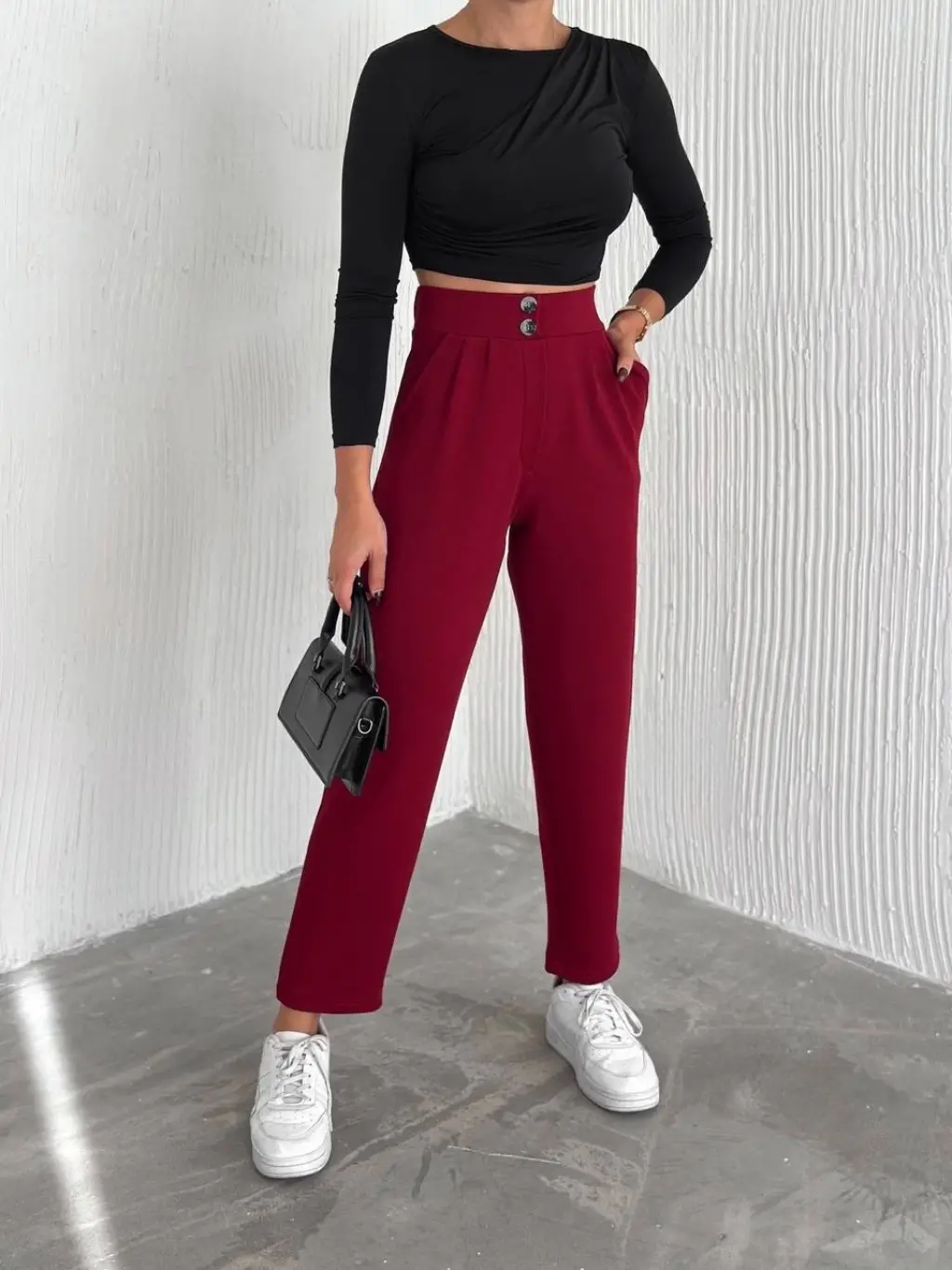 Bordo Renk Yüksek Bel Maskülen Kesim Kumaş Pantolon