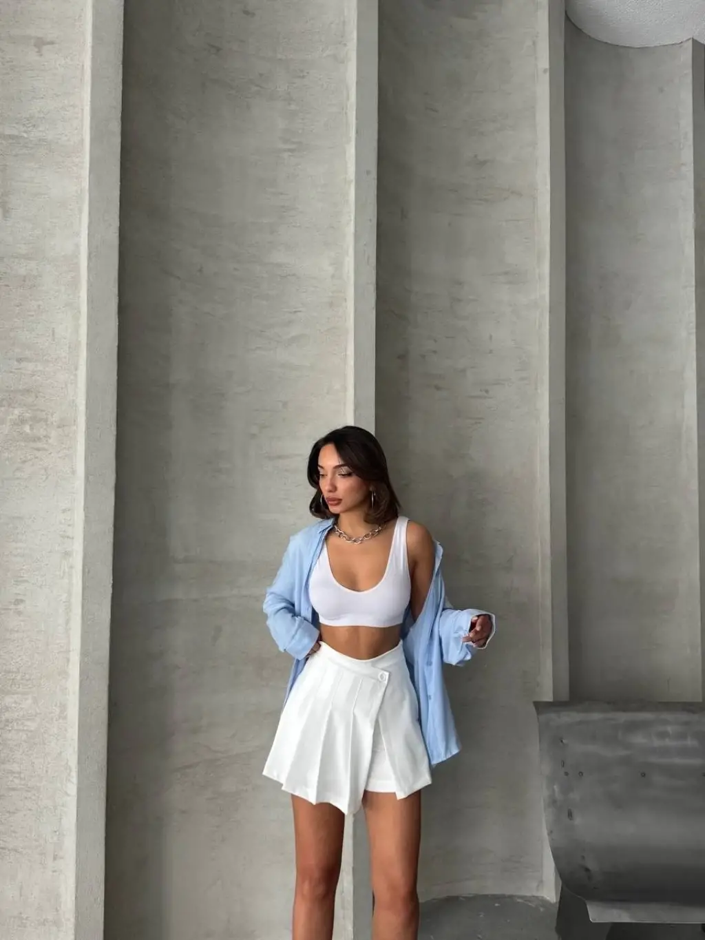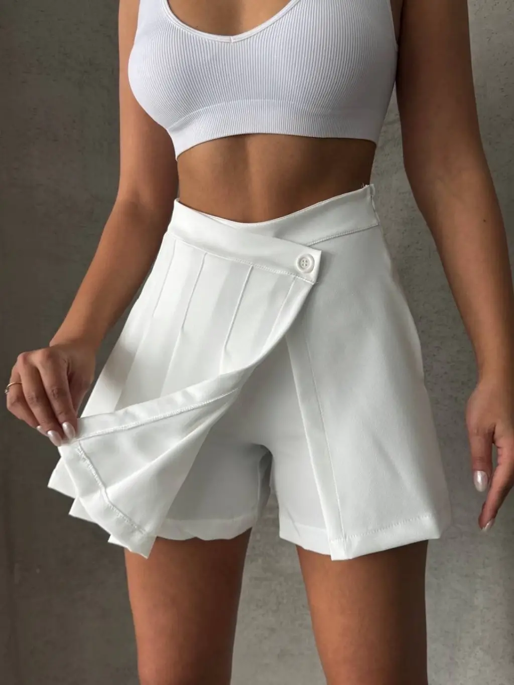Bu beyaz piliseli düğmeli şort etek, yaz aylarında şıklığı ve rahatlığı bir arada arayan kadınların vazgeçilmezi olacak. İster günlük şıklıkta isterseniz özel bir davette tercih edebileceğiniz bu şort etek, gardırobunuzun en favori parçalarından biri olmaya aday.
