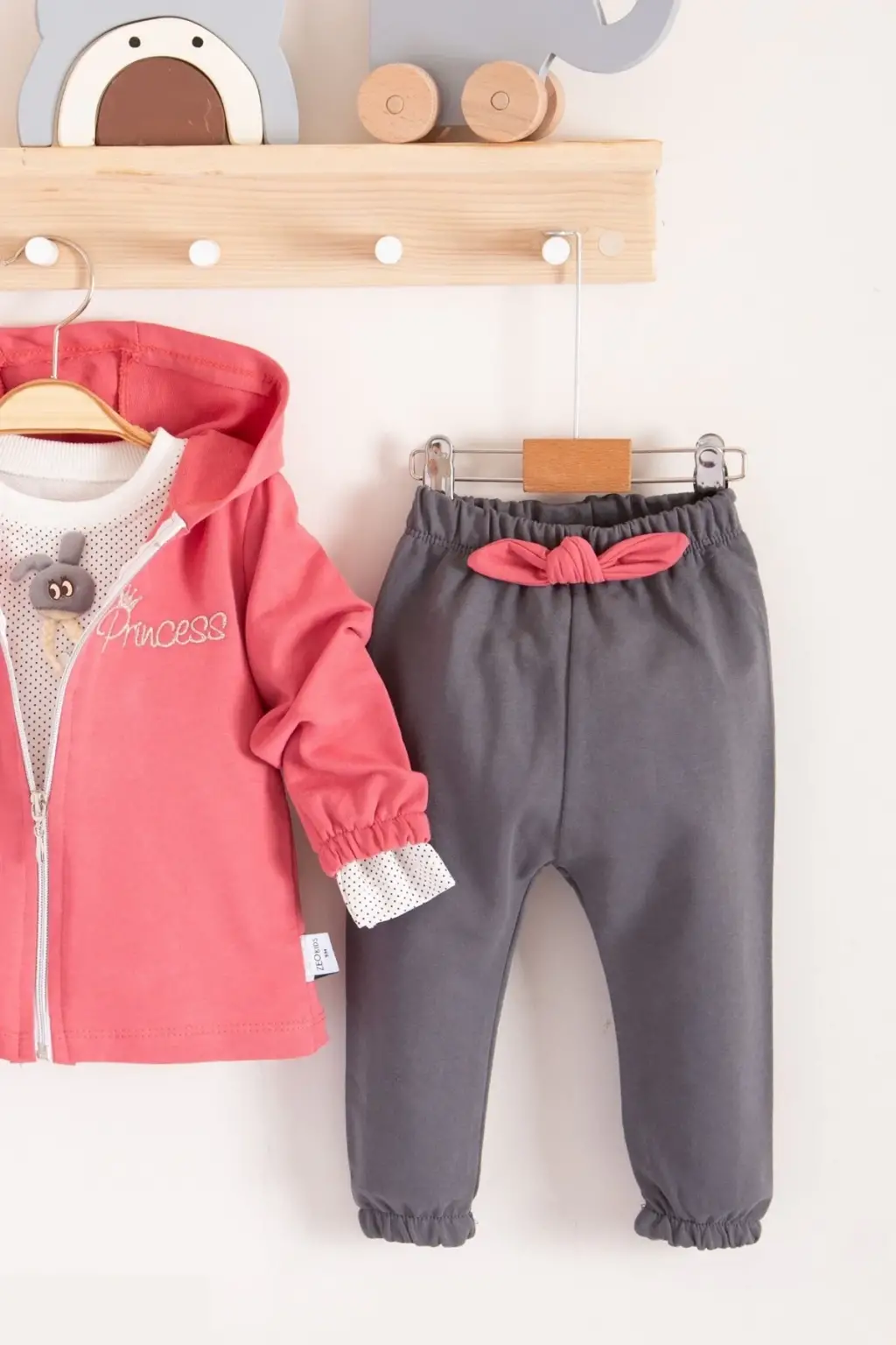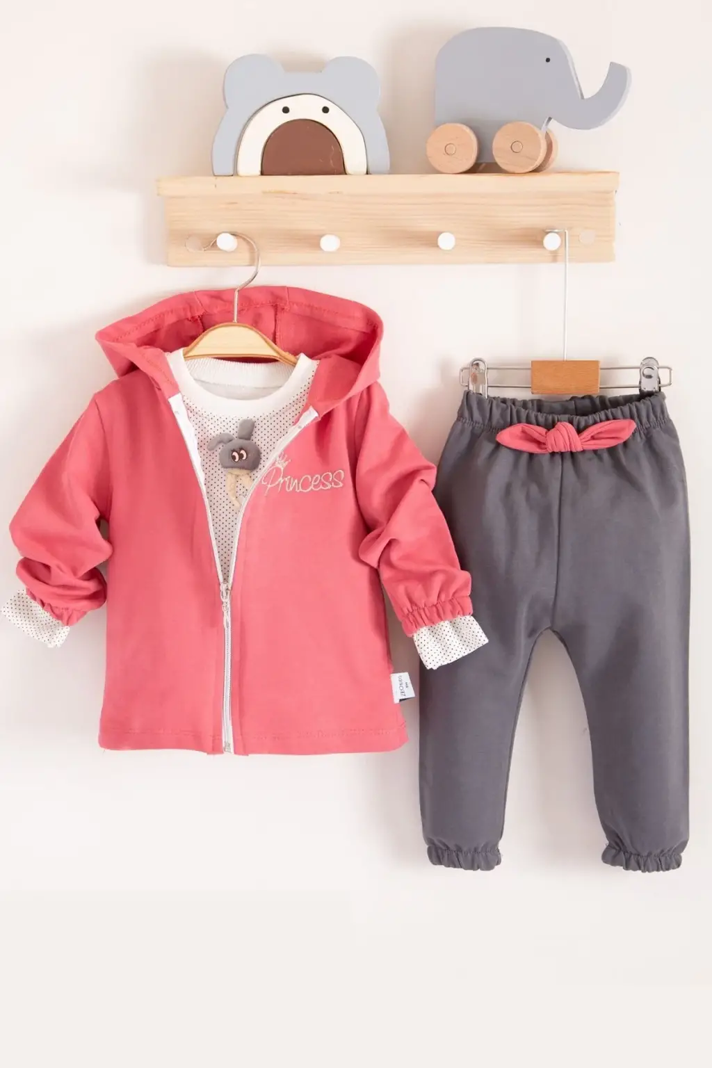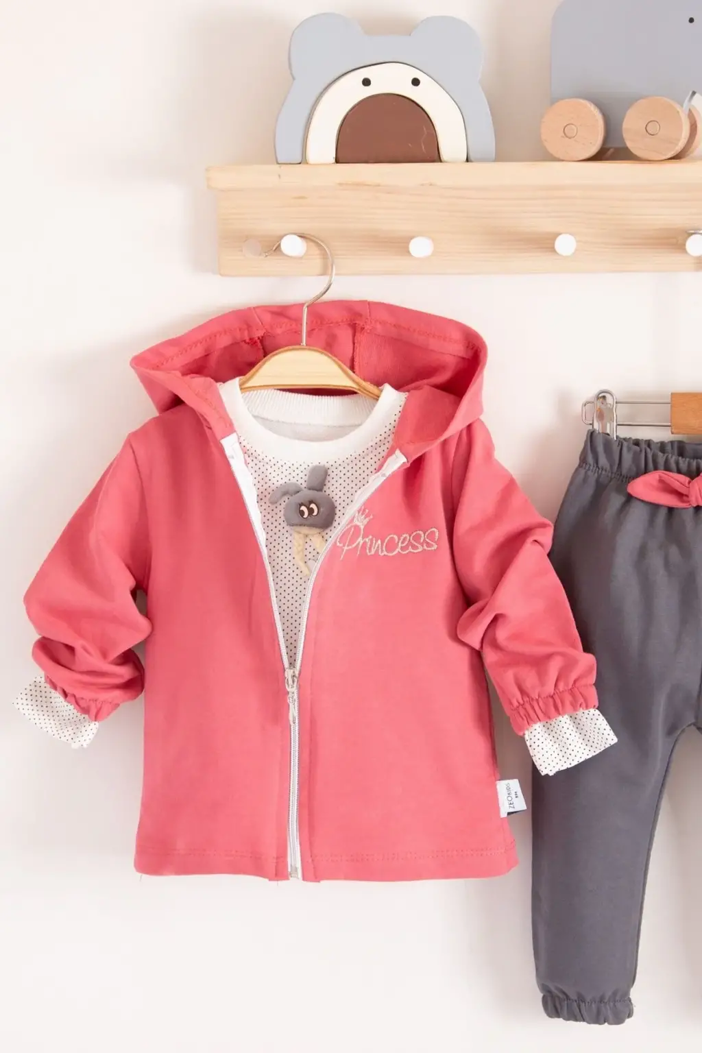 Prences Nakışlı Kapişonlu 3'lü % 100 Pamuk Kız Bebek Takımı