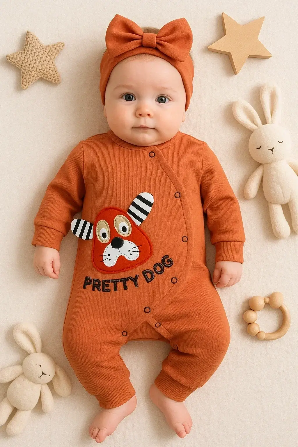 Pretty Dog Nakışlı Bandanalı % 100 Pamuk Kız Bebek Tulumu
