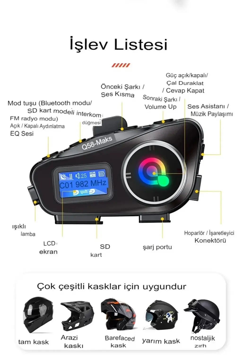 Q58-max Radyolu 2 Kişi Bağlantılı Bluetooth Kask Kulaklık Ekranlı Fenerli Müzik Ve Telsiz Intercom