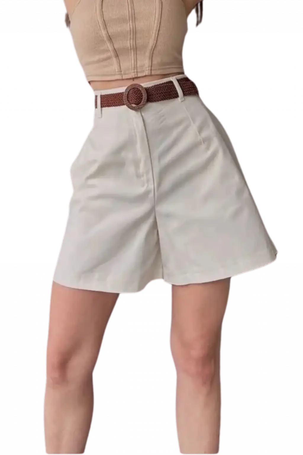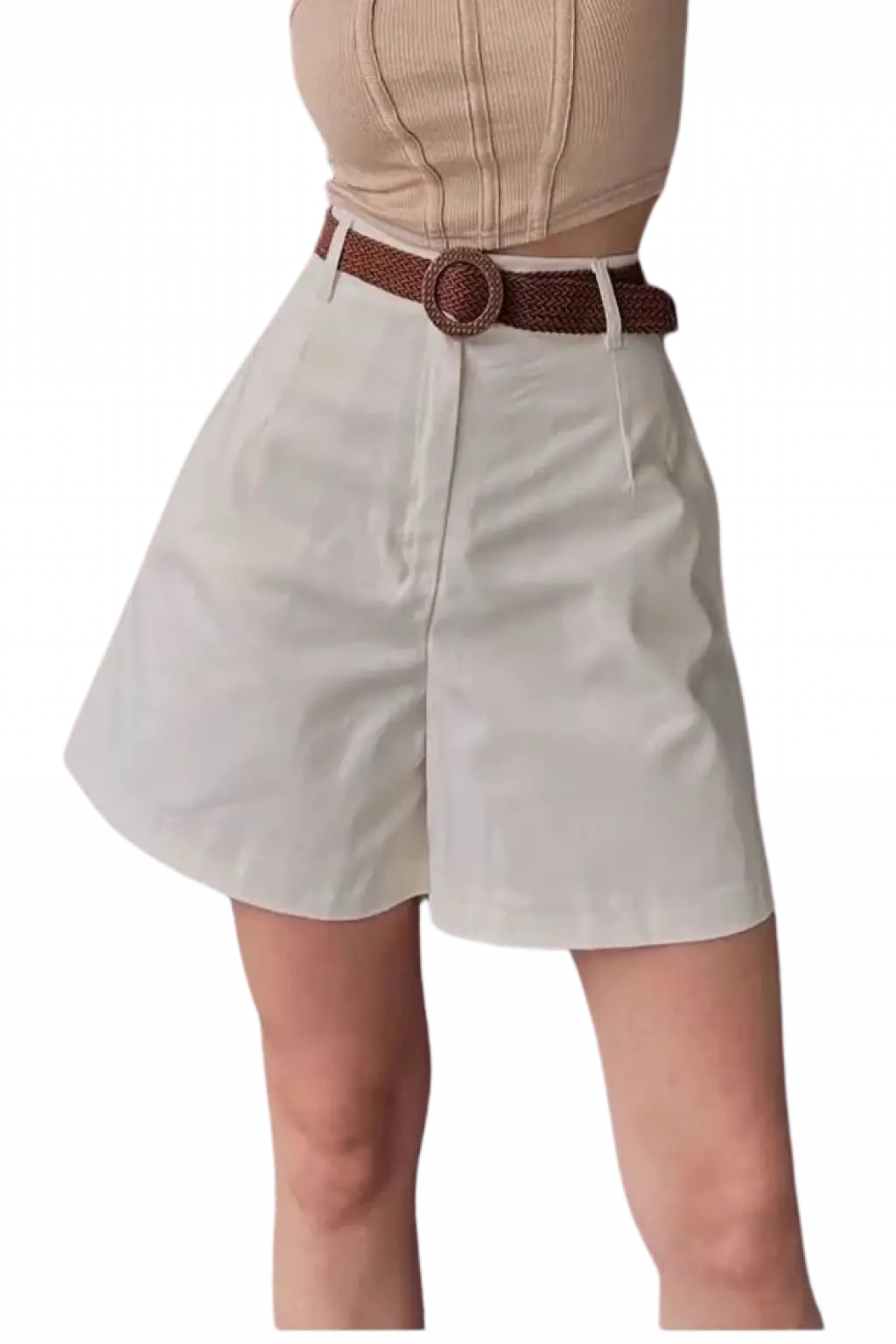 Rahat Kesim Kemerli Mom Şort - KREM
