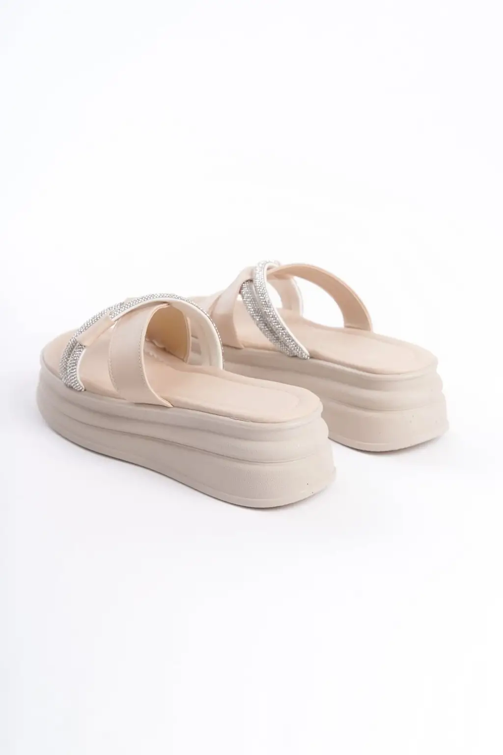 RUBY Düz Topuklu Taşlı Çapraz Şeritli Kalın ve Rahat tabanlı ayakkabı Tabaan Bayan Terlik CKısa Topuk - Krem