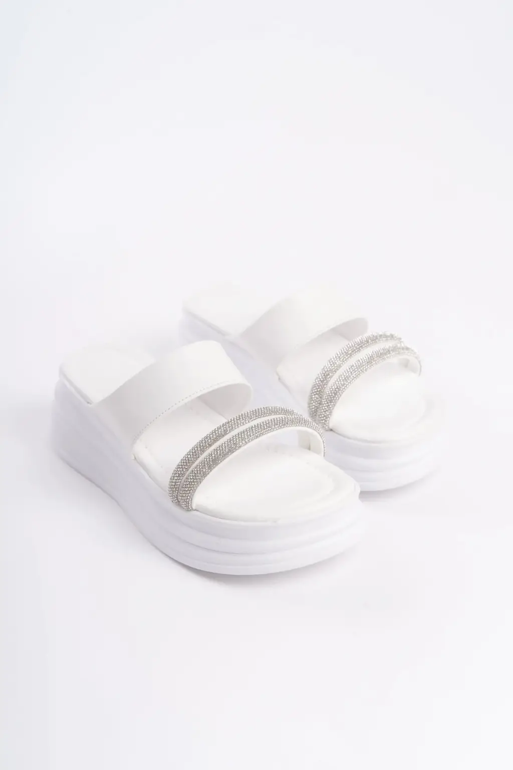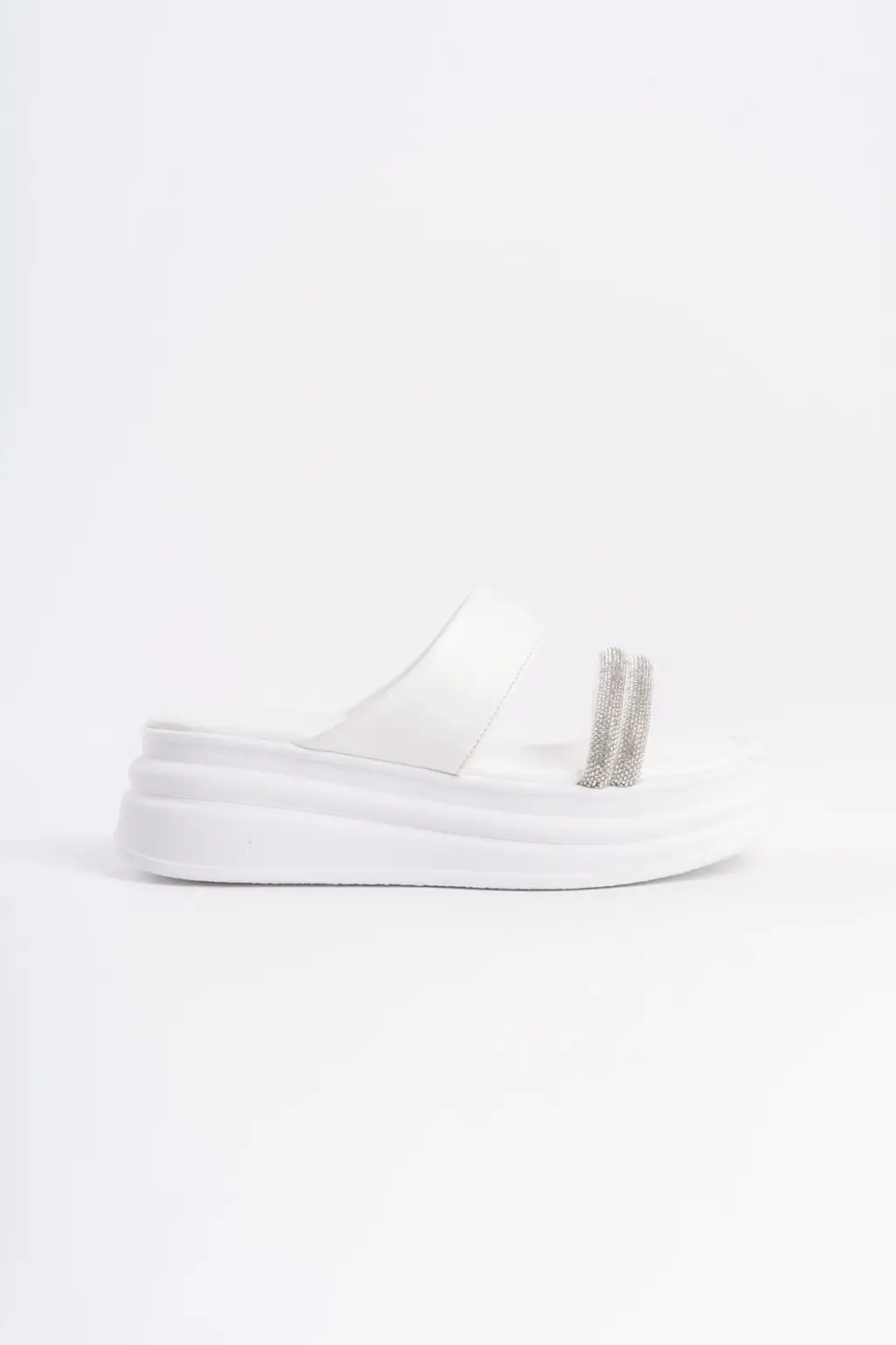 SARAH Düz Topuklu Taşlı Şeritli Kalın ve Rahat tabanlı ayakkabı Tabaan Bayan Terlik CBT - Beyaz