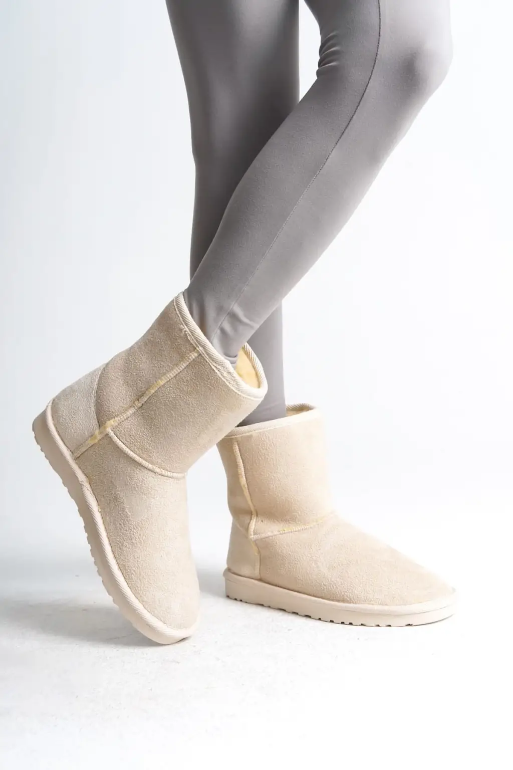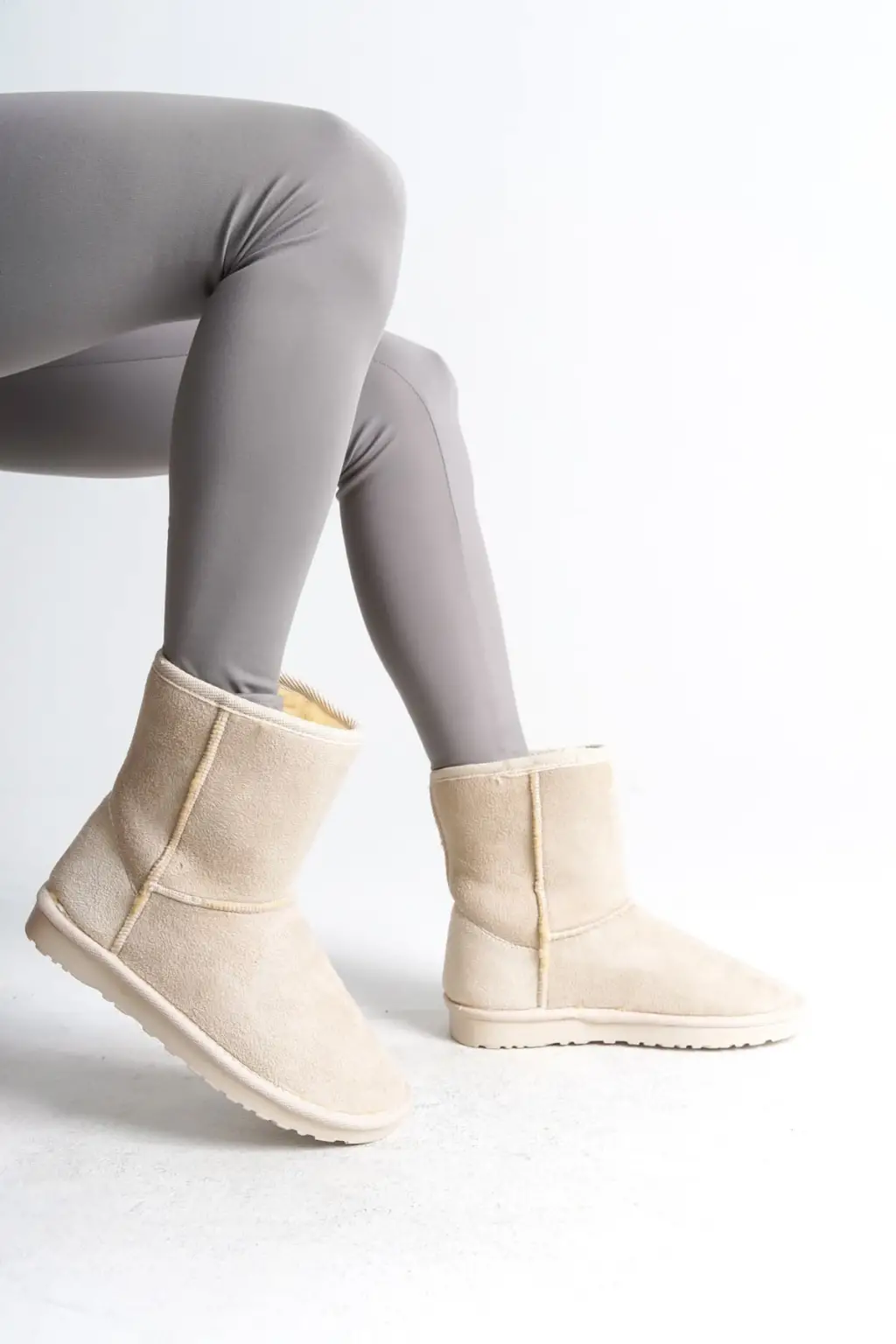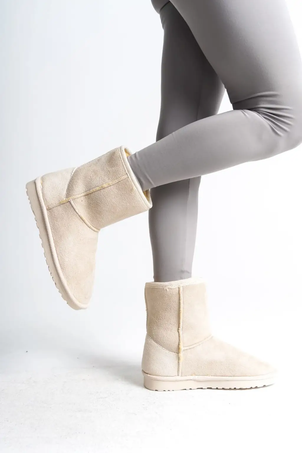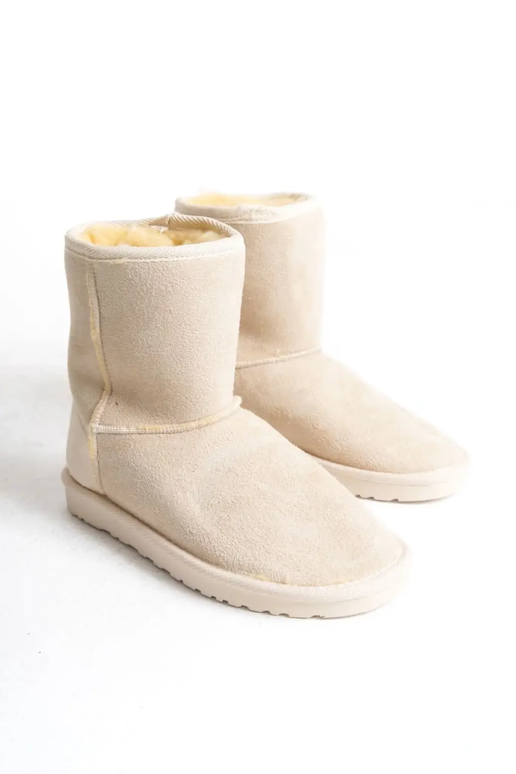 Omarı Krem Süet İçi Kürklü Bayan Bot - Bağcıksız, Düz Taban