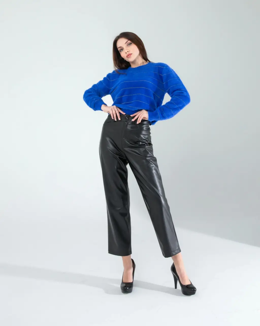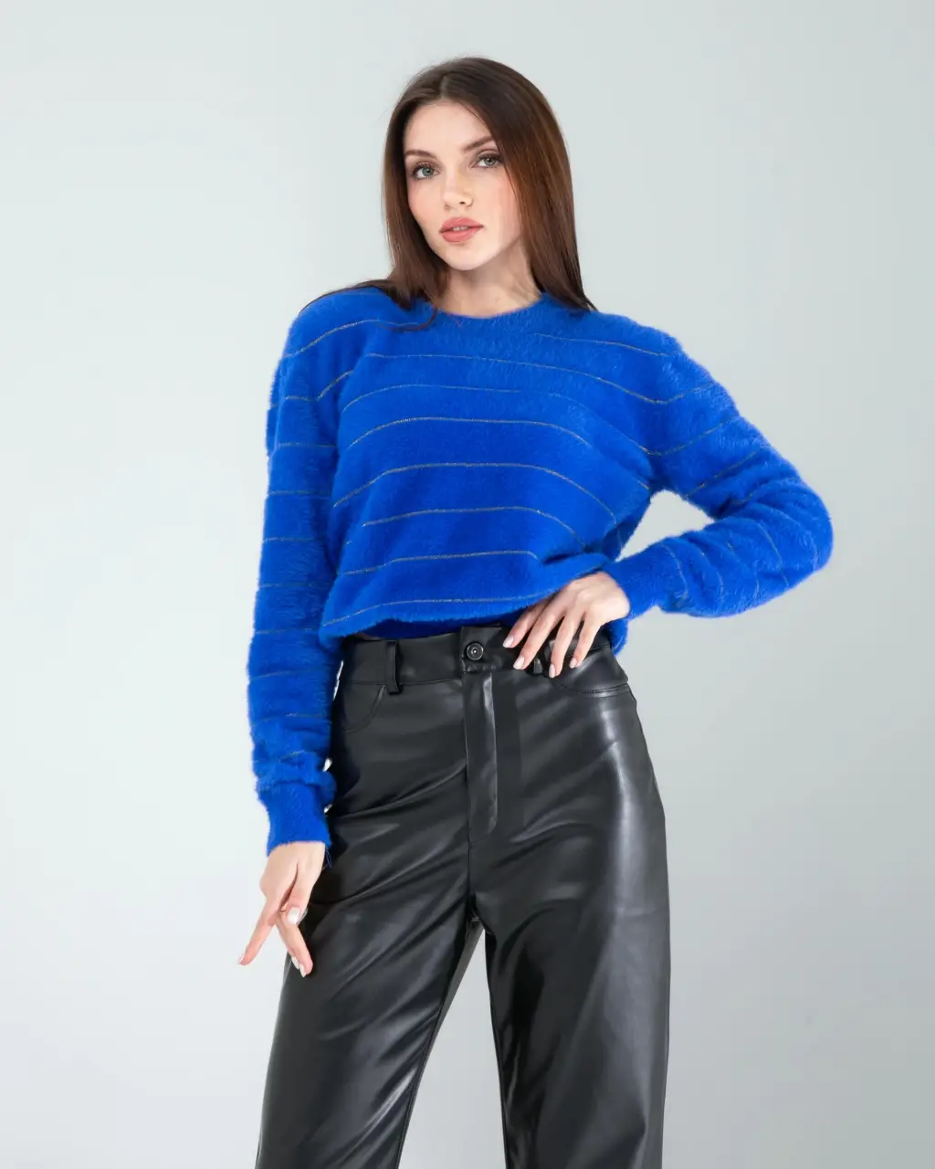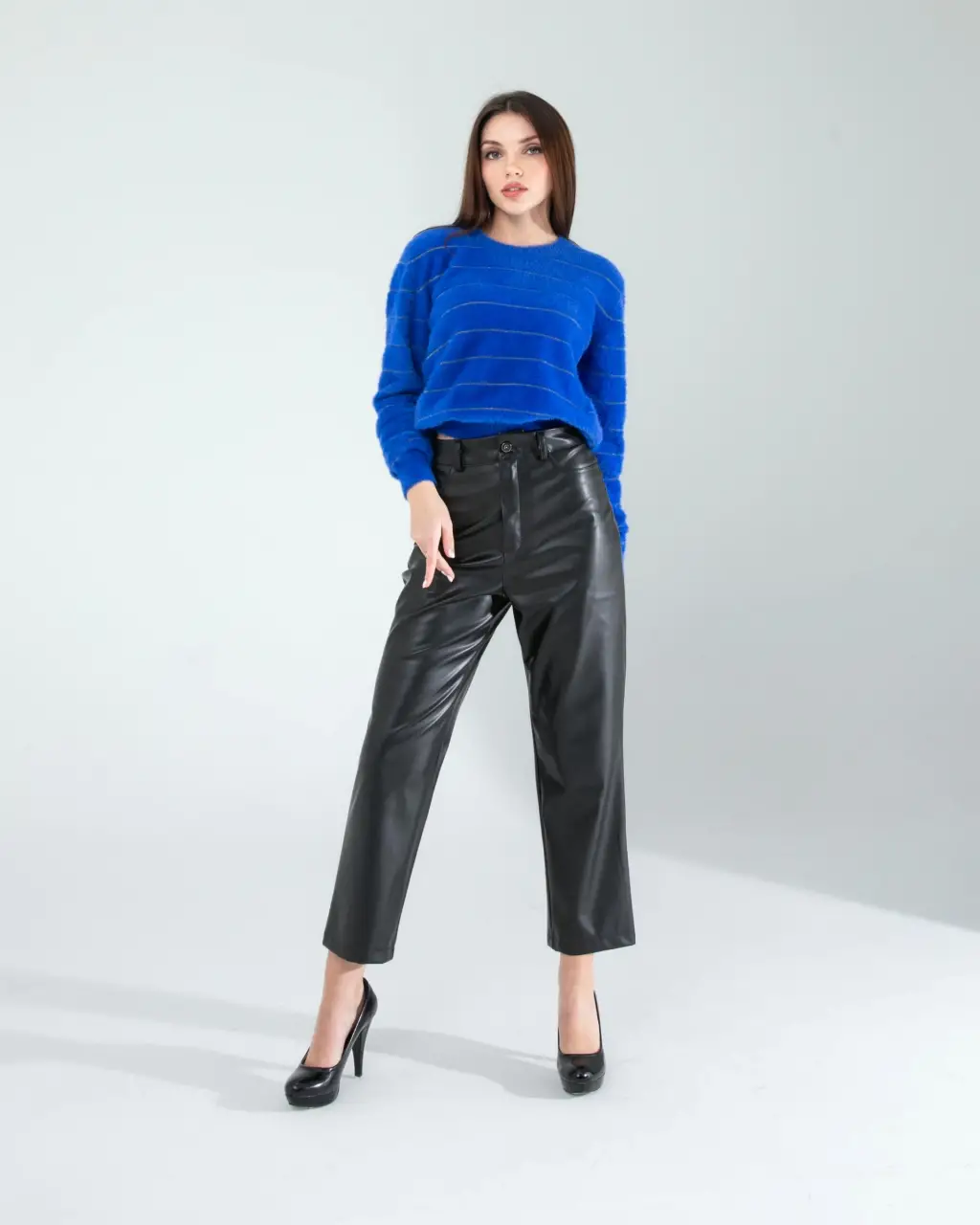 Günlük Kombin: Sim şeritli saks renkli trikonuzu siyah skinny jean ve beyaz spor ayakkabılarla tamamlayın. Üzerine deri ceket ekleyerek casual şıklık yakalayabilirsiniz.