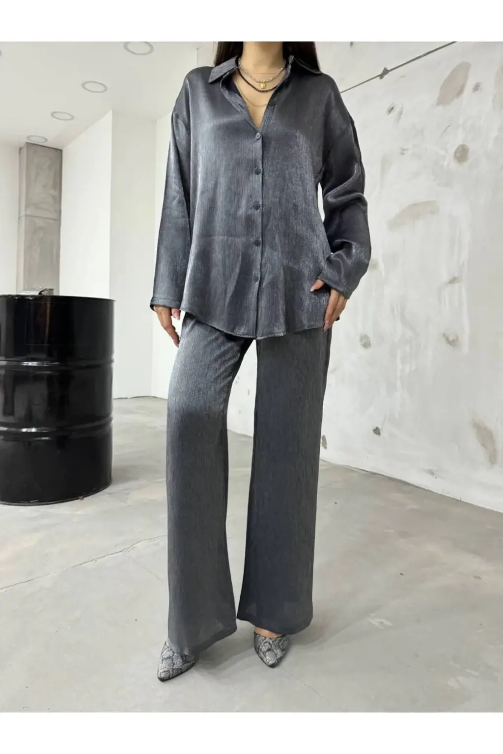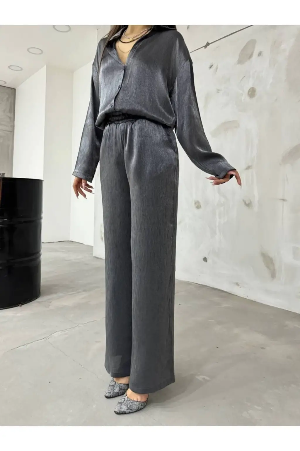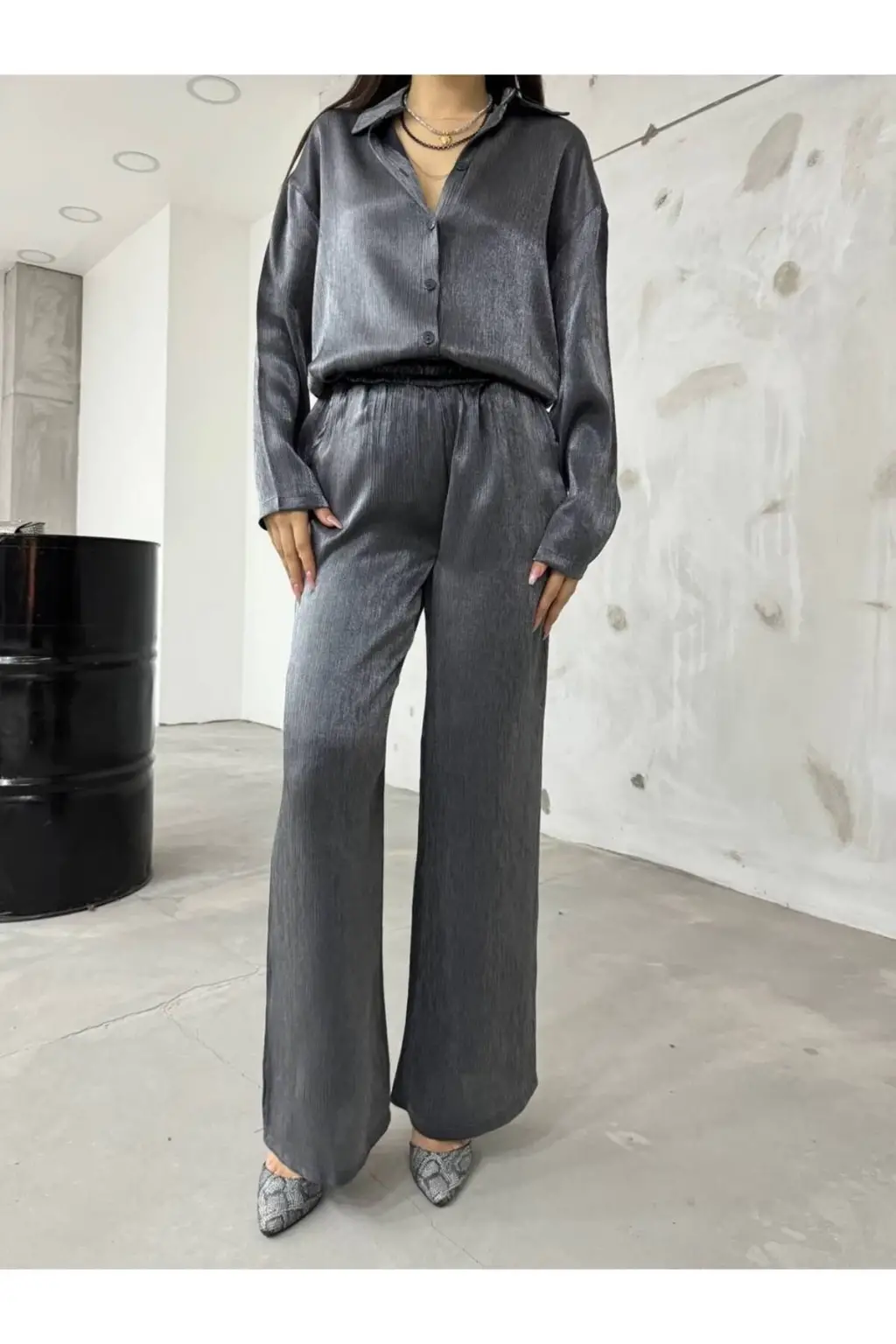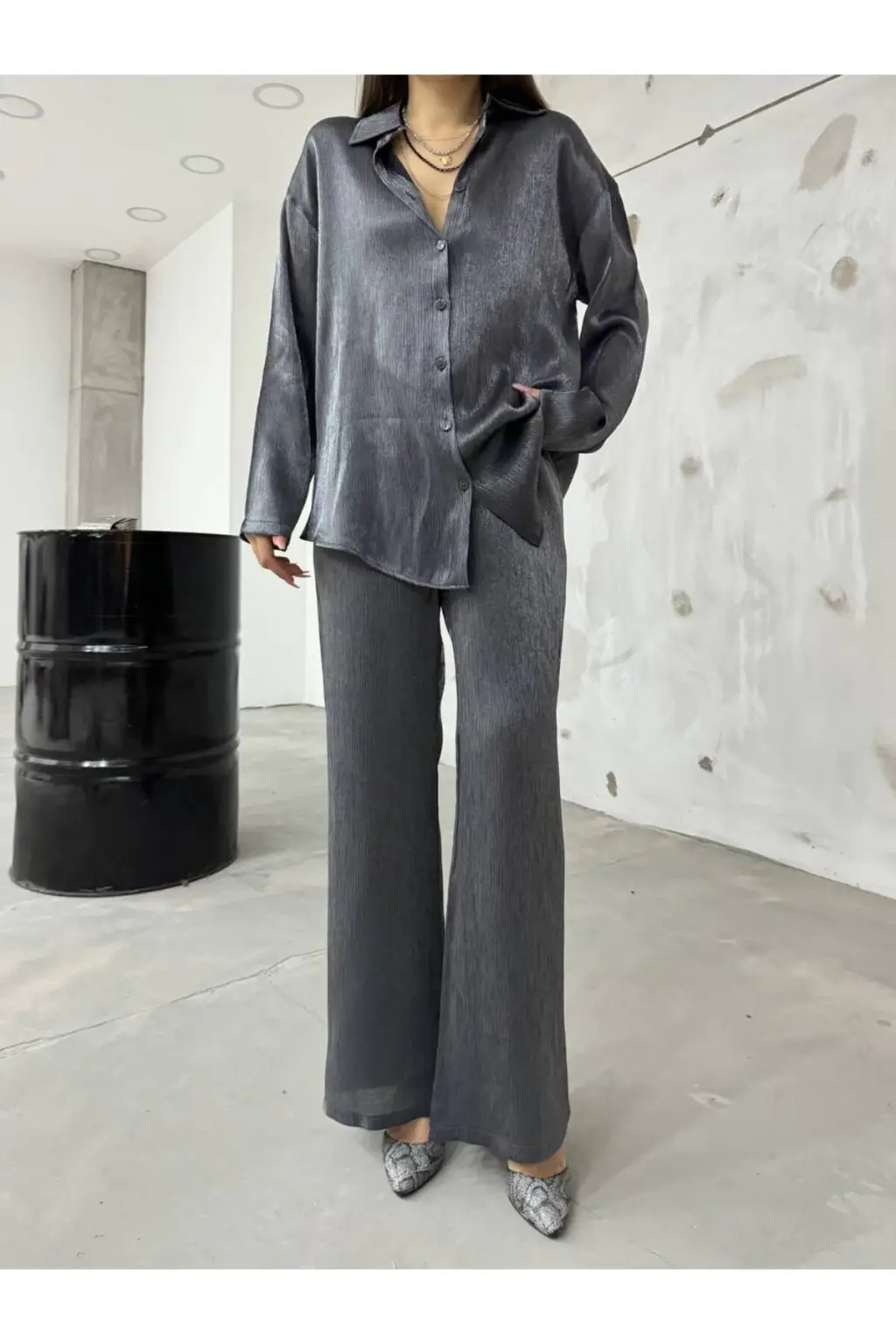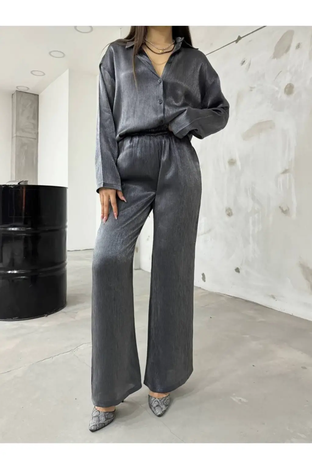 Günlük Şıklık: Simli Antrasit Şifon Takım’ı beyaz spor ayakkabılar ve sade bir kol çantası ile kombinleyerek günlük şıklığınızı tamamlayabilirsiniz.