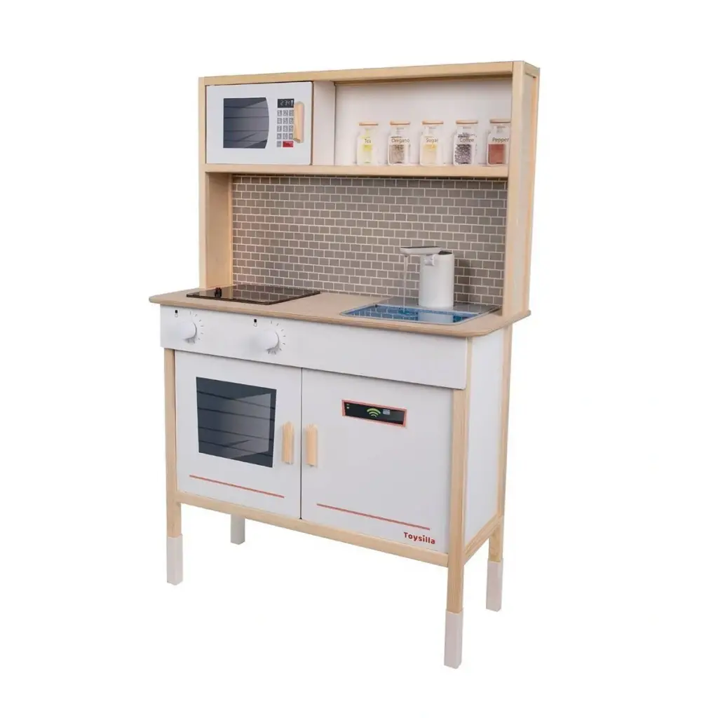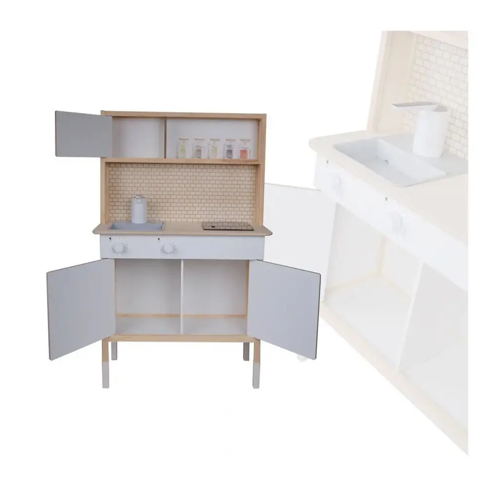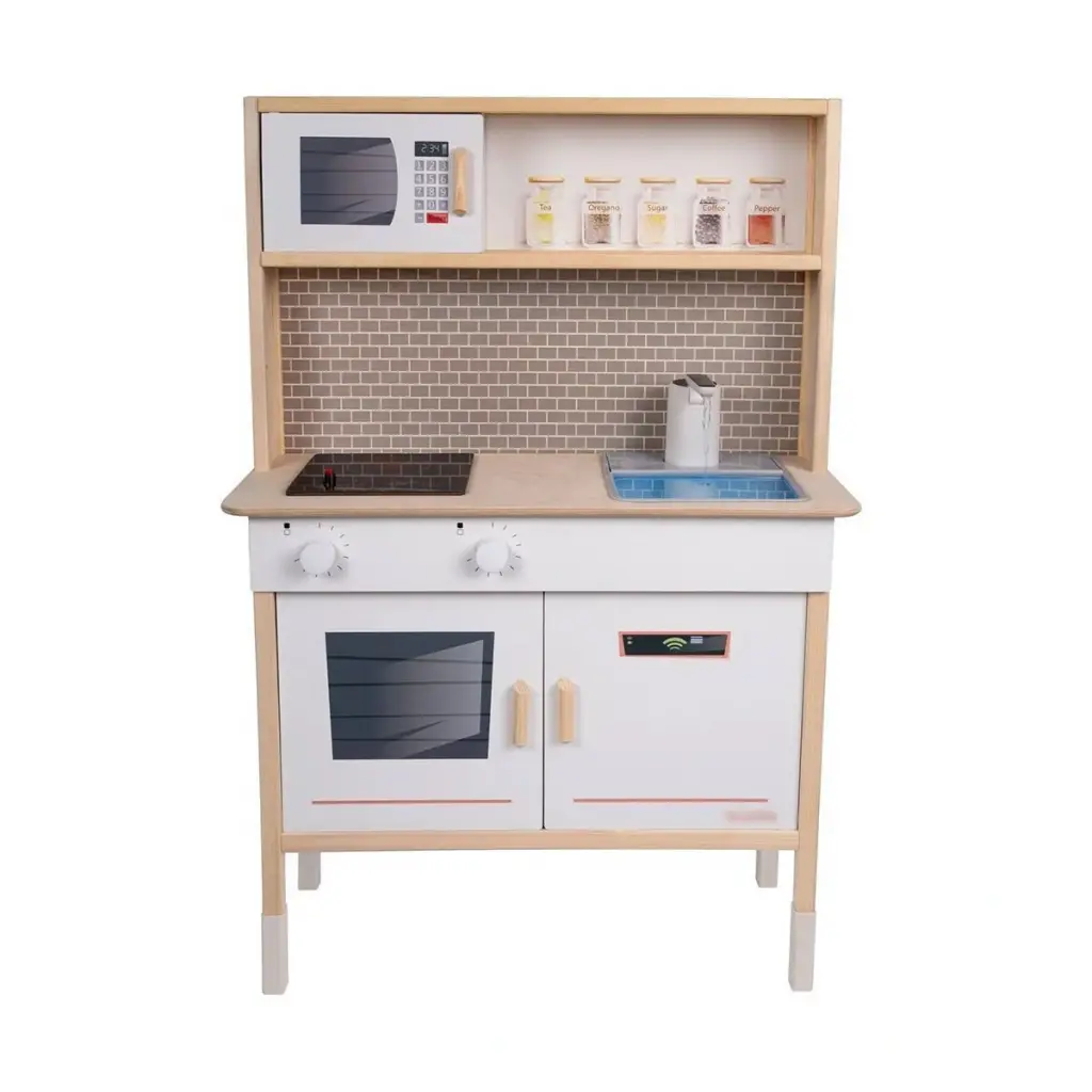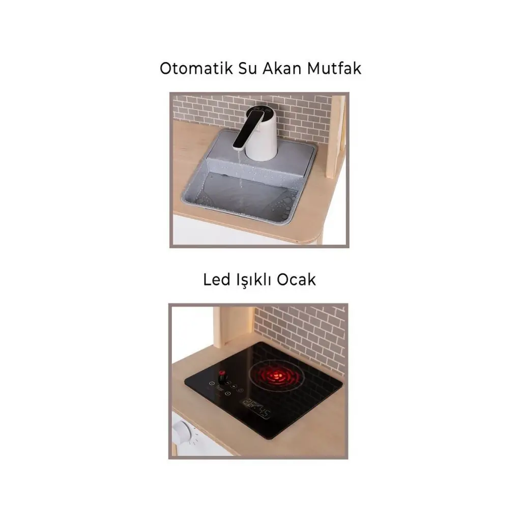Küçük şeflerin mutfak heyecanını gerçeğe dönüştüren bu premium ahşap mutfak seti, çalışan su musluğu ve LED aydınlatmalı ocağıyla benzersiz bir oyun deneyimi sunuyor -Premium Özellikler: -Gerçek Su Akışlı Musluk - Çocuklar için büyülü bir deneyim - LED Işıklı Ocak - 6 adet AA pil ile çalışır (piller dahil) - Suya Dayanıklı Yüzey - Huş kontra malzeme ile uzun ömürlü kullanım -Canlı UV Baskı - Solmayan renkler ve detaylı tasarım -Montessori Uyumlu - Yaratıcı oyunlar için ideal