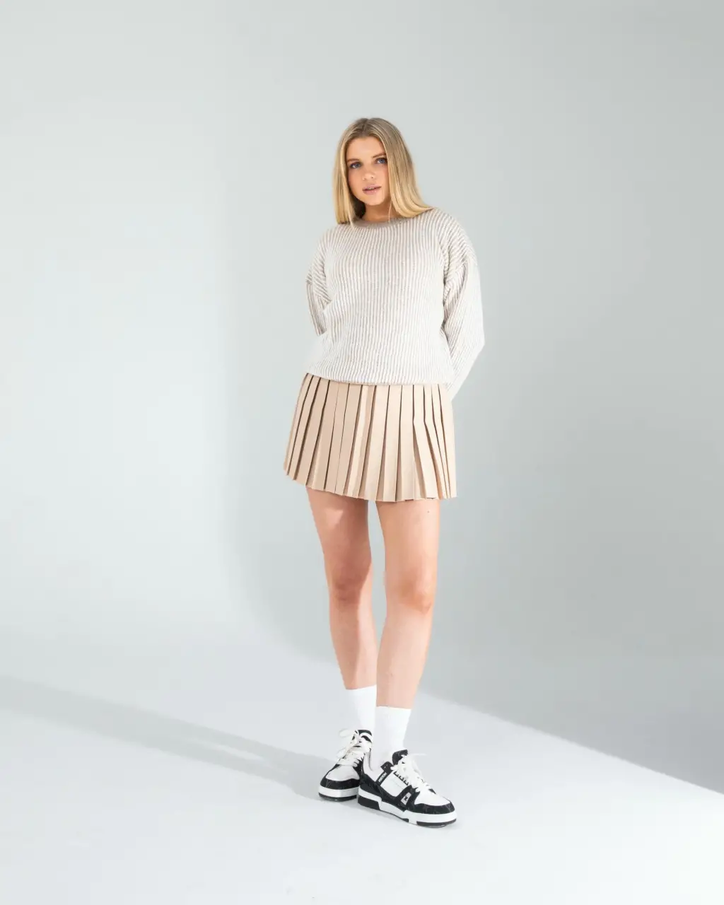 Kot Pantolon ve Beyaz Spor Ayakkabı: Günlük rahat stil için taş dikey çizgili triko kazağı, klasik mavi kot pantolon ve beyaz spor ayakkabılarla tamamlayın. Üzerinize alacağınız deri ceketle de stilinize hareket katabilirsiniz.