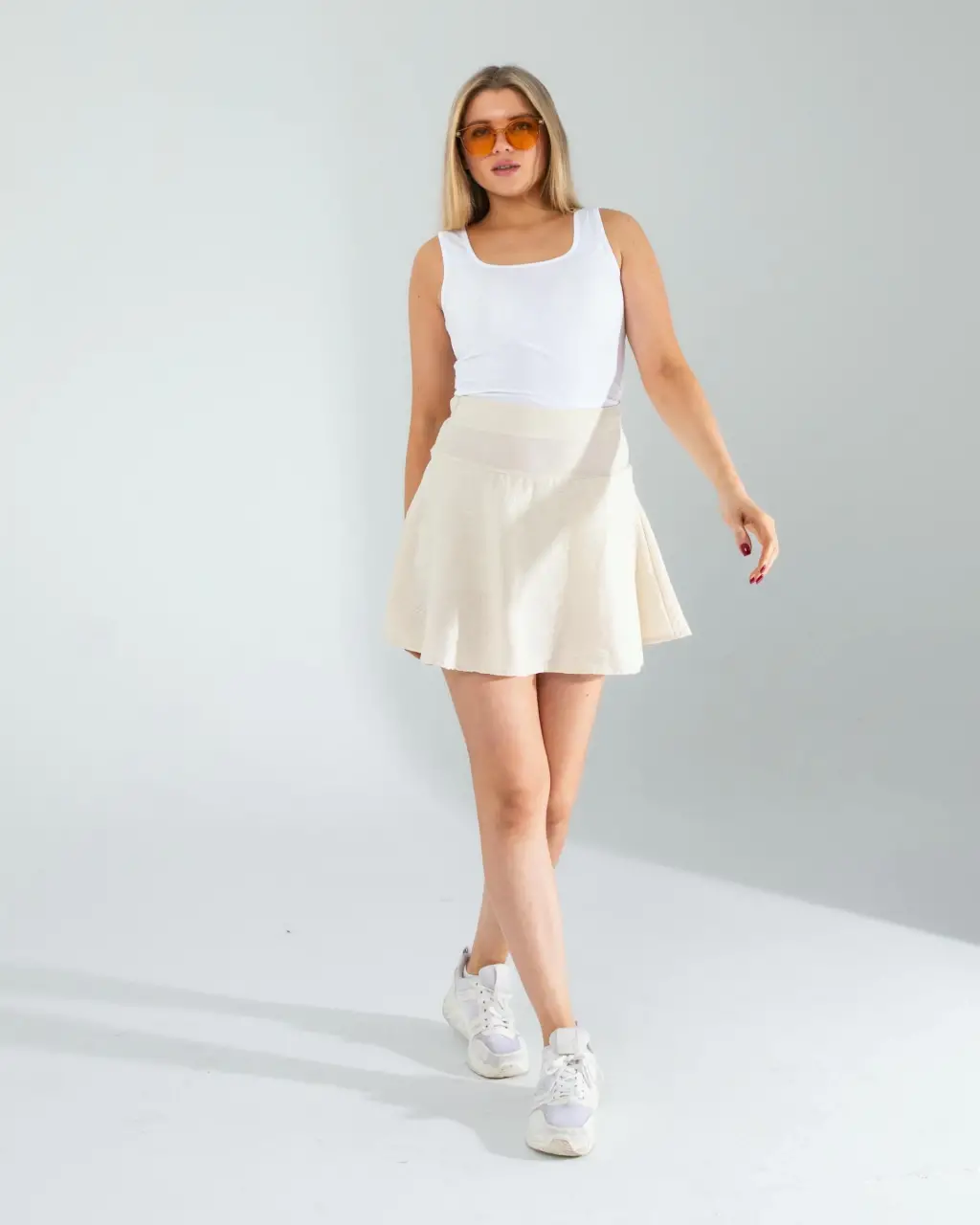 Spor Şıklık: Şort eteğinizi renkli bir crop top ve spor ayakkabılar ile kombinleyin. Sırt çantası ve güneş gözlüğü ile sportif ve rahat bir görünüm yakalayın