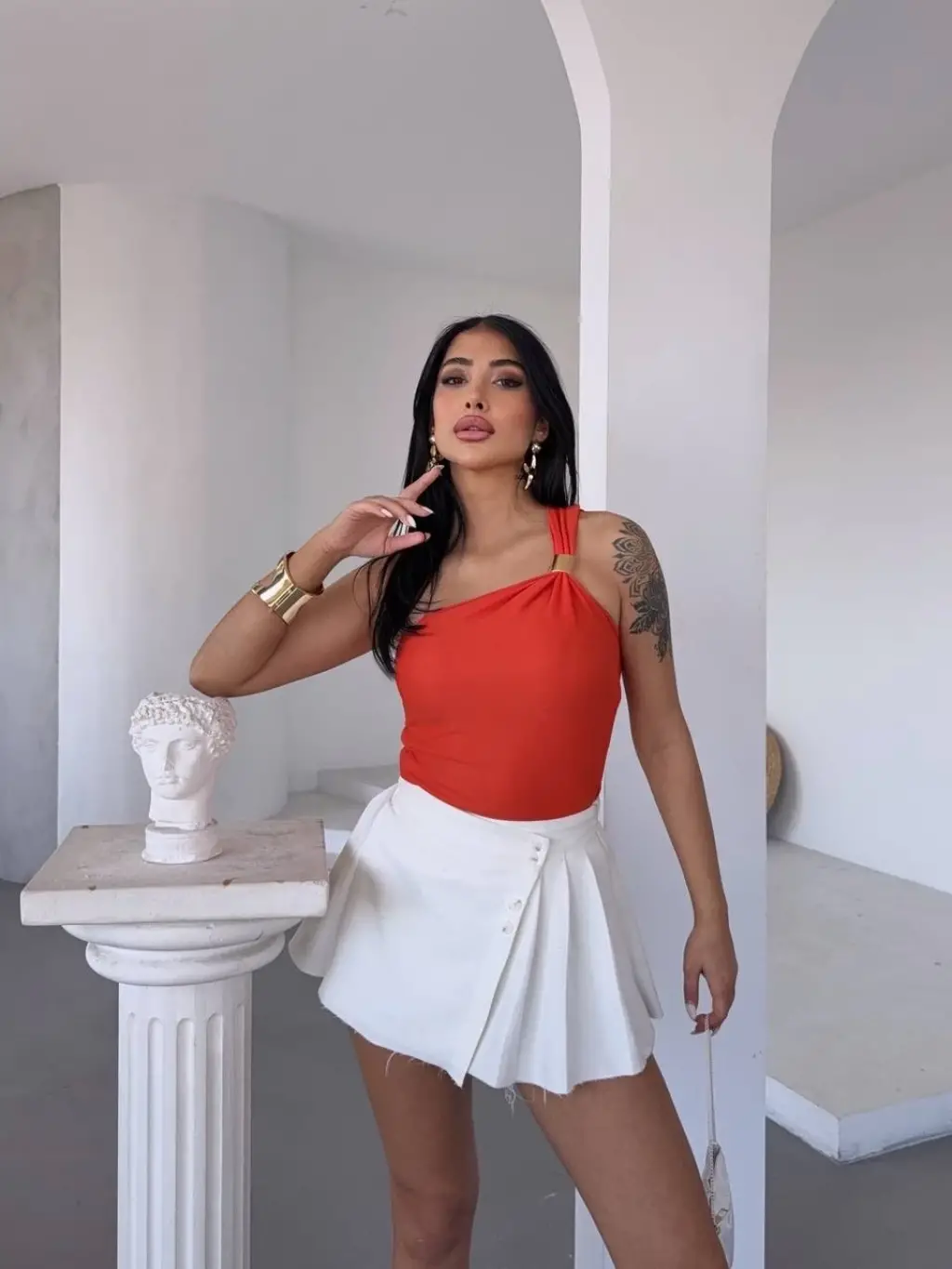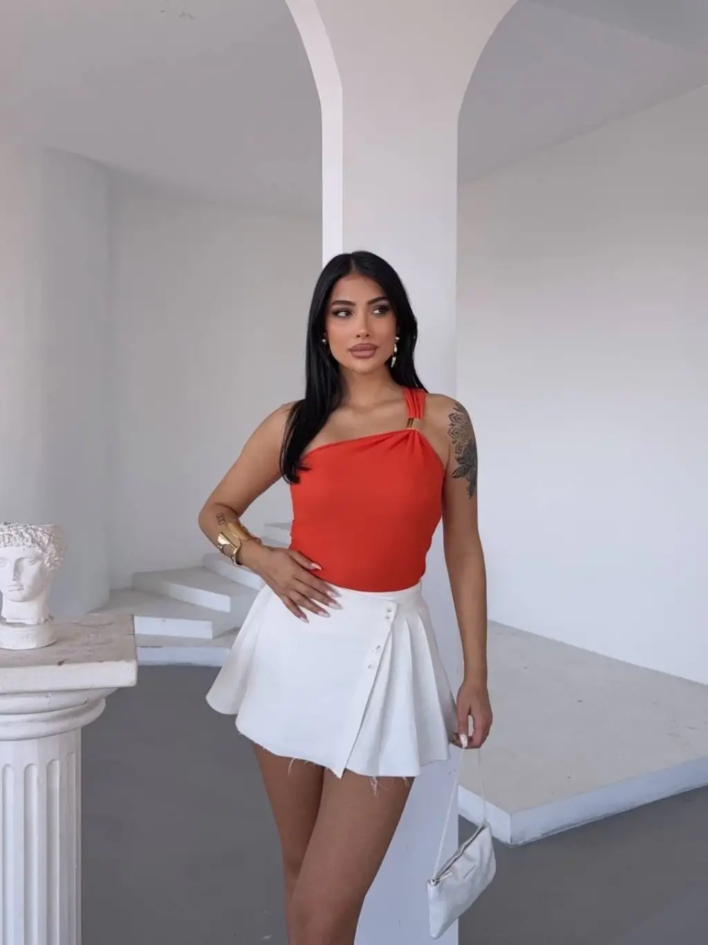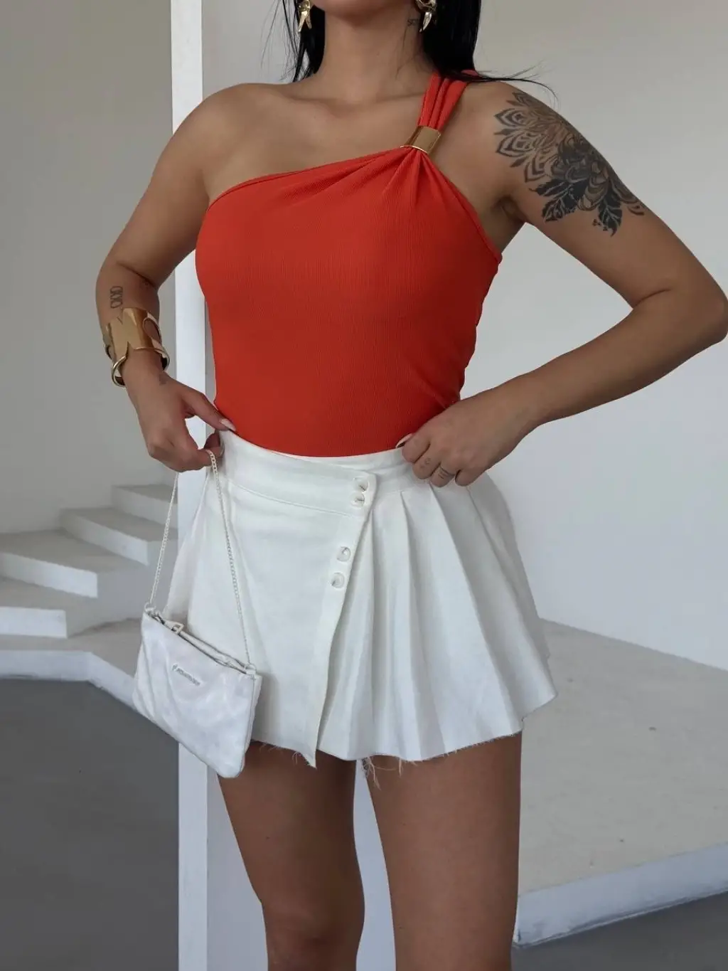 - Tek omuzlu tasarımı ile fark yaratan bir görünüm sunar.