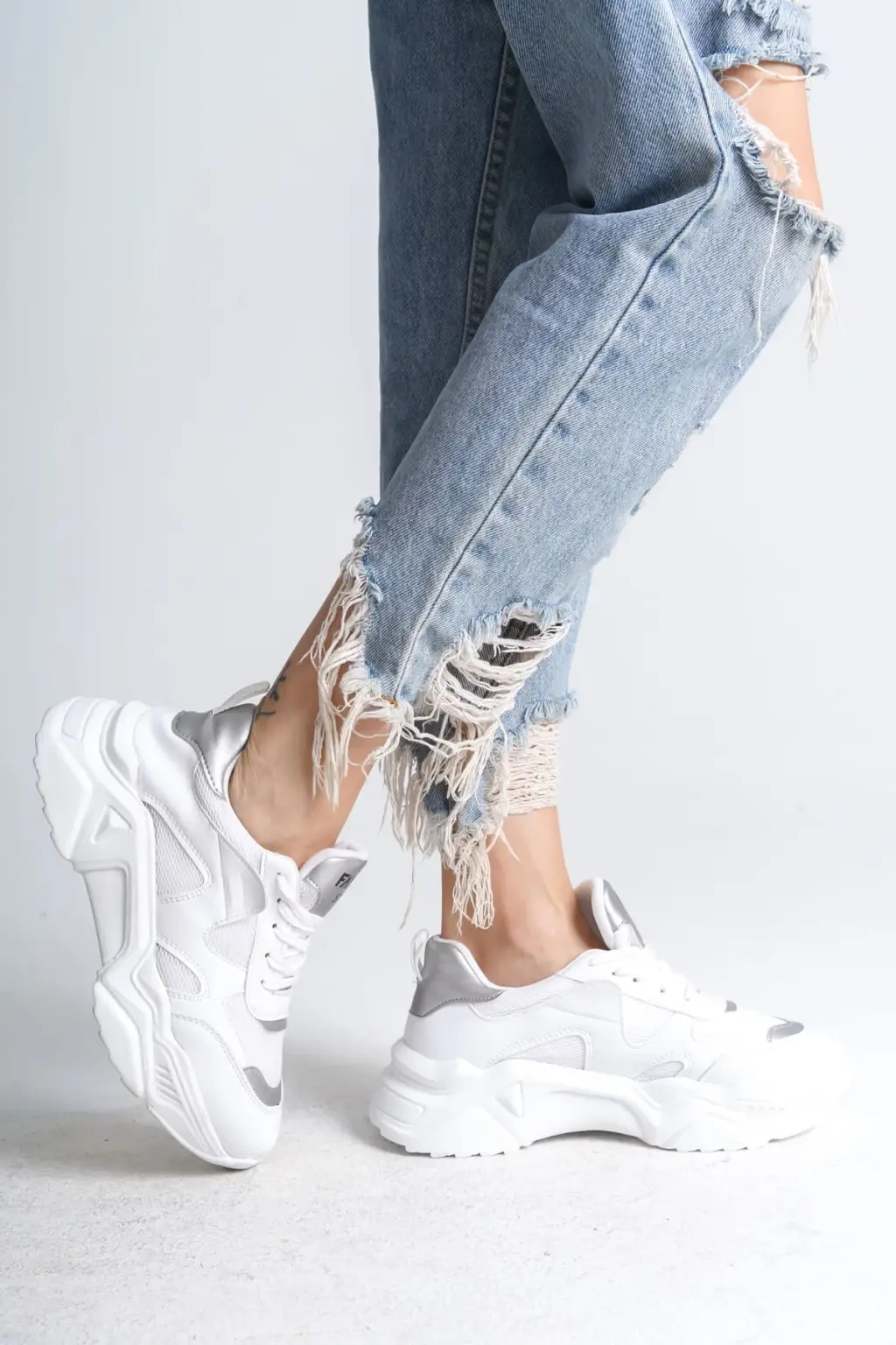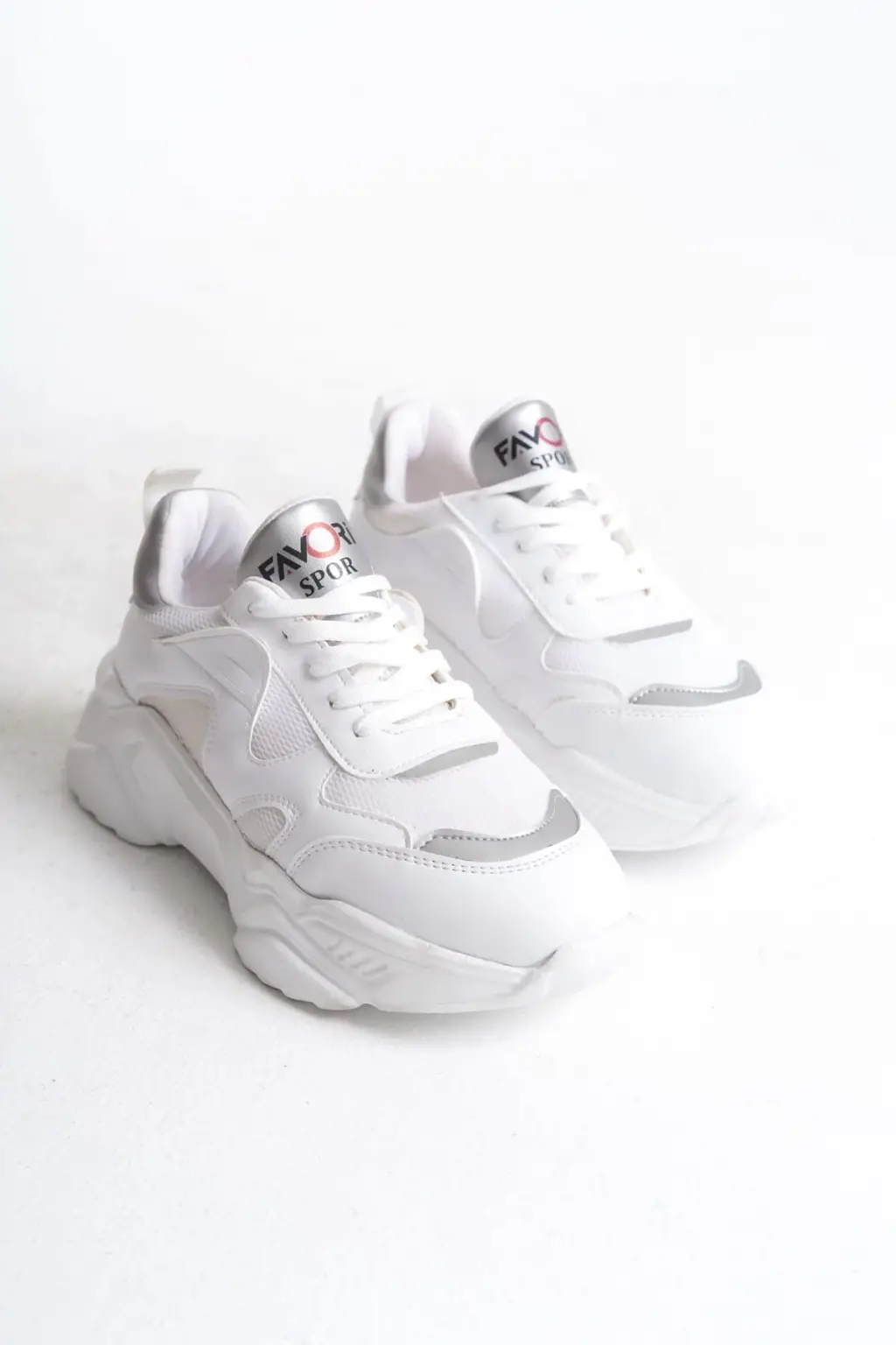 Omarı Rahat Tabanlı Bayan Spor Ayakkabı - Tabaan Triko Detaylı Beyaz/Gri