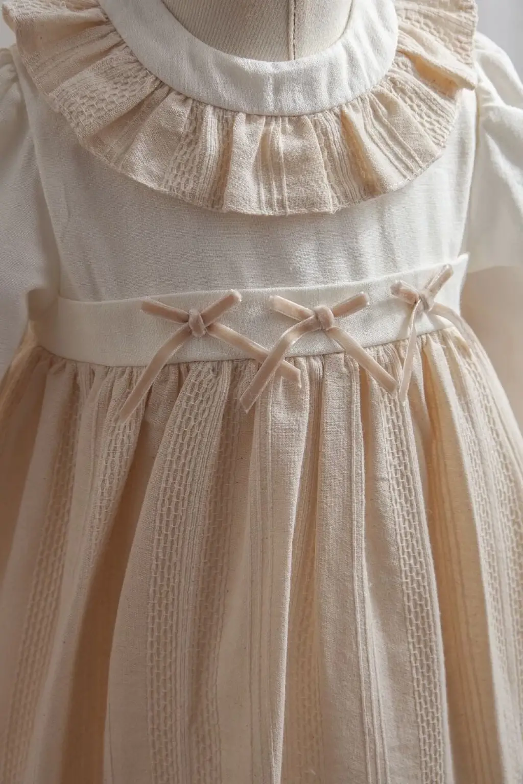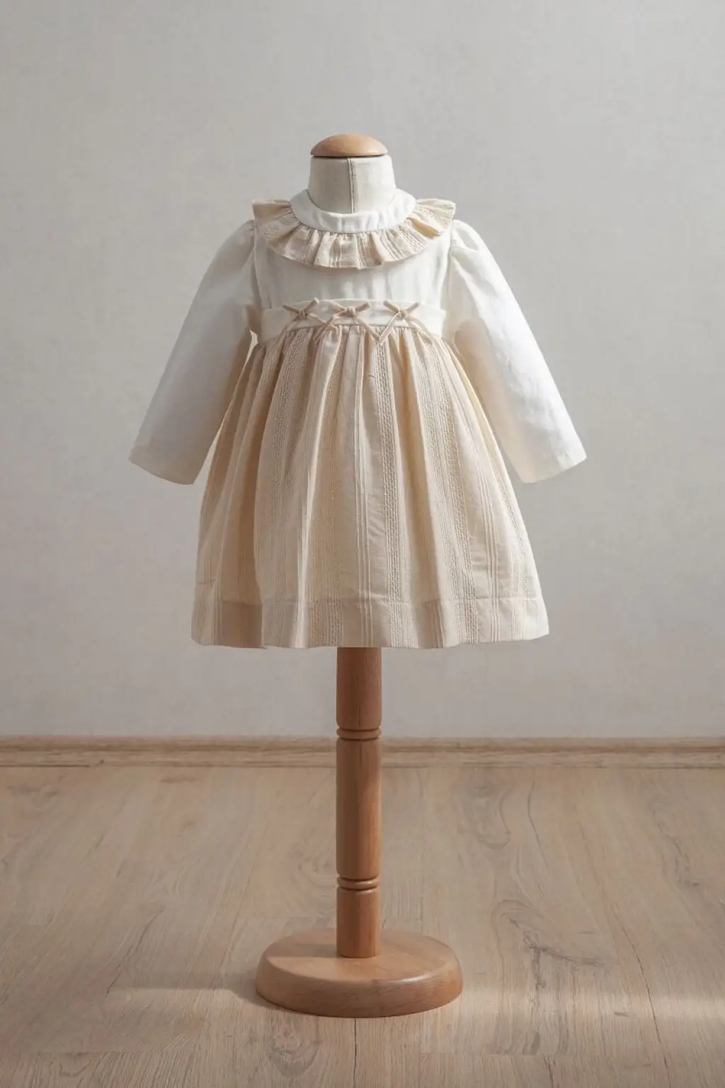 Kız bebeklere özel tasarlanan bu açık sarı ve pembe elbise, zarif detayları ve modern dokusuyla ön plana çıkıyor.
