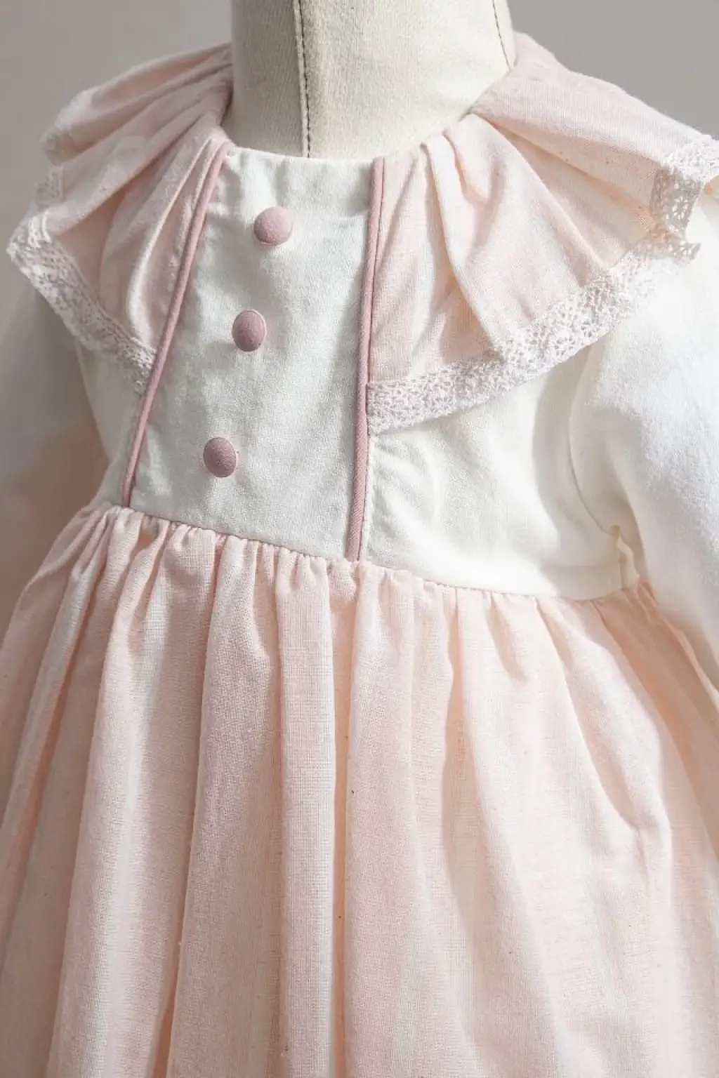 Bu özel tasarım kız bebek elbisesi, açık sarı ve pembe rengin sıcaklığını ve zarif detayları bir araya getiriyor.